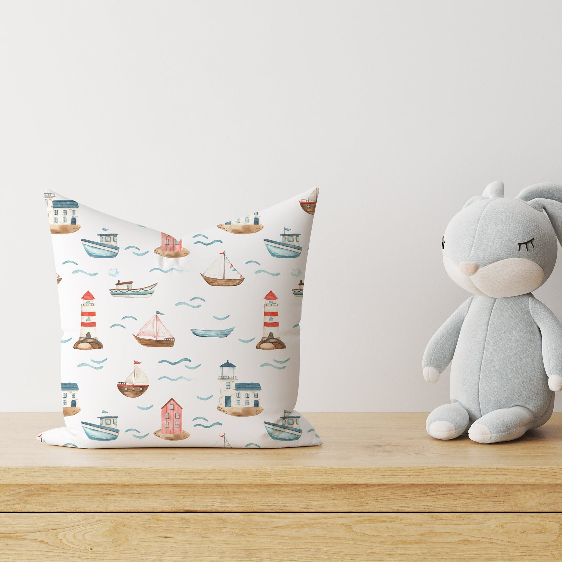 Unser "Am Meer" Dekokissen holt die frische Brise und das Abenteuer der Küste direkt ins Kinderzimmer. Bunte Segelboote, Leuchttürme und kleine Inseln laden zum Kuscheln, Träumen und Wegträumen ein – wie ein Kurzurlaub am Meer, Tag für Tag.