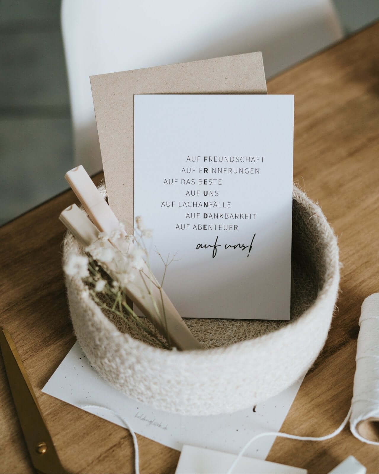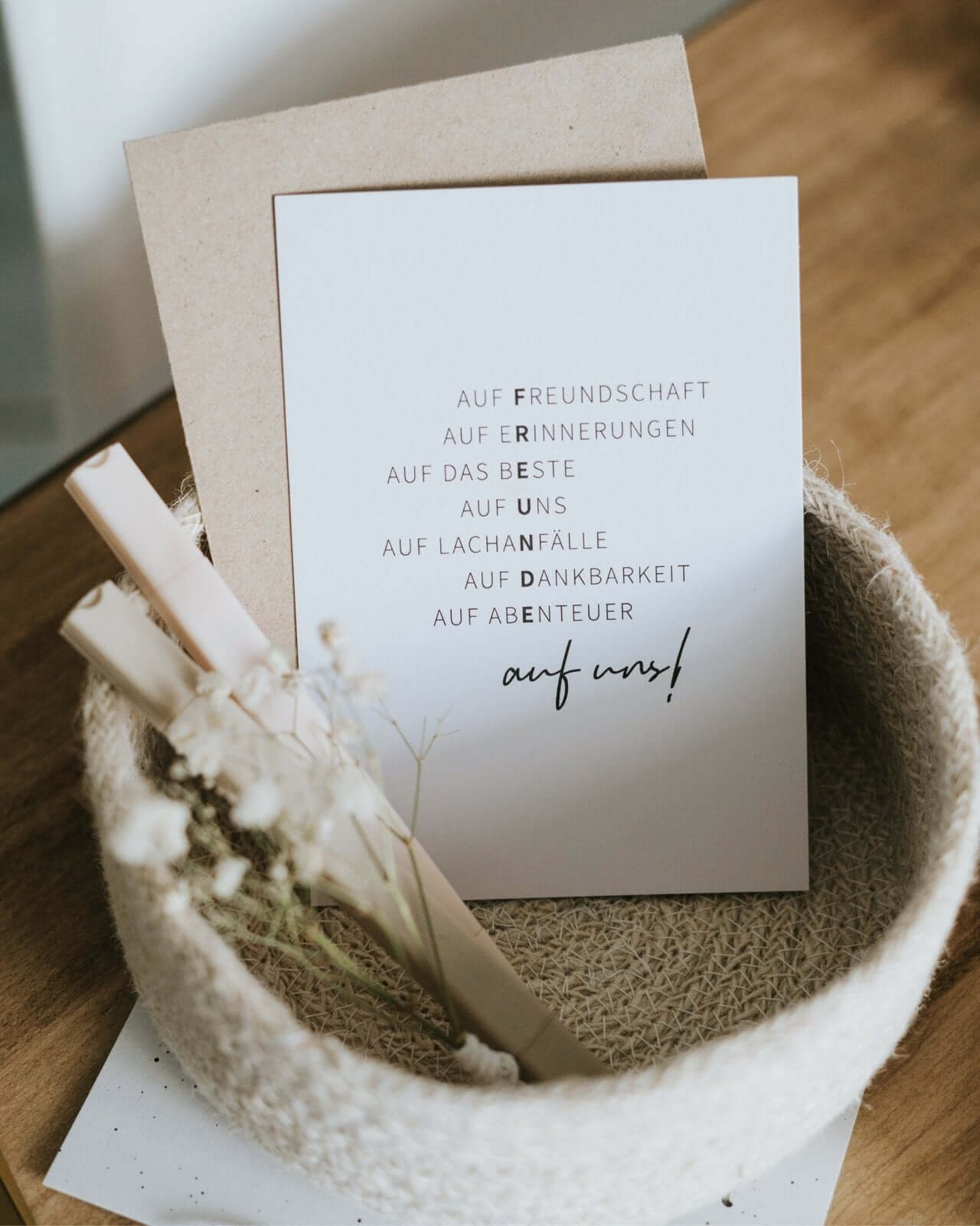 Stell dir vor, deine beste Freundin öffnet diese Karte und liest: „Auf Freundschaft, auf Erinnerungen, auf uns.“ Ein Moment voller Wärme, der eure gemeinsame Geschichte feiert – ehrlich, emotional und stilvoll. Ob als Geschenk zum Geburtstag, als Überraschung zwischendurch oder als leises Dankeschön: Diese Postkarte bringt auf den Punkt, was euch verbindet. Viele Heldenglück-Kund:innen verschenken sie immer wieder – weil sie berührt, erinnert und Nähe schafft. Und weil sie nachhaltig produziert wird, fühlt sich das Schenken gleich doppelt gut an.