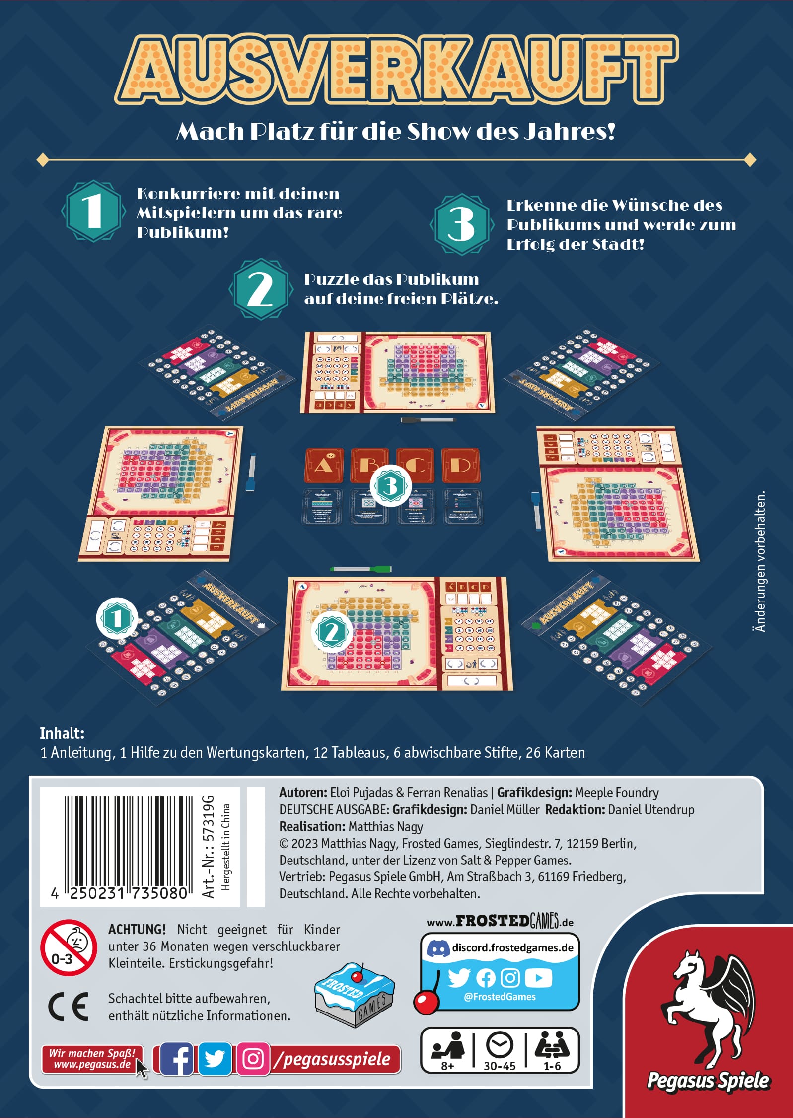 In Ausverkauft ist es Ziel der Spielenden, ihr eigenes Theater bestmöglich mit Gästen zu besetzen. Dazu liegen in jeder Partie des Share & Write Spiels vier Wertungskarten aus, deren Bedingungen es zu erfüllen gilt. In jeder Runde müssen die Spielenden genau eine Ticketformation in ihrem Theater eintragen. Wie genau diese Formen aussehen, verändert sich im Laufe des Spiels, denn jede*r Mitspielende modifizert pro Runde genau ein Ticket. Zu Beginn jeder neuen Runde werden dann die Tableaus mit den Tickets weitergegeben, sodass die Anpassungen nun auch für die Mitspielenden relevant werden. Platzanweiser-Fähigkeiten erlauben es jede Runde außerdem, entweder Siegpunkte zu nehmen oder eine Sonderfähigkeit auszuspielen.