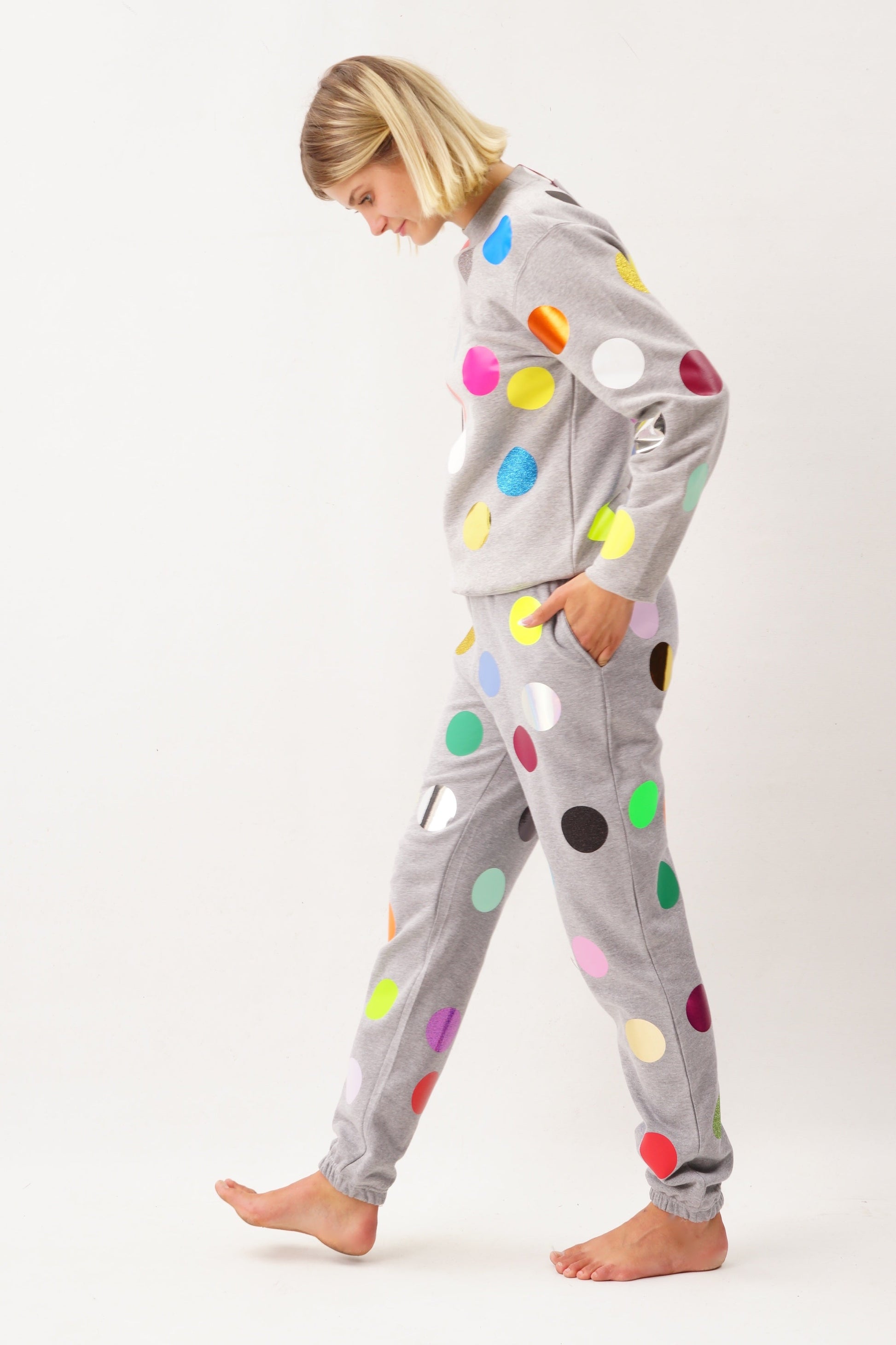 Elevate your casual wardrobe with these vibrant unisex joggers bursting with playful multicolored balls adorning both sides. Now also available in a trendy wide-leg cut!