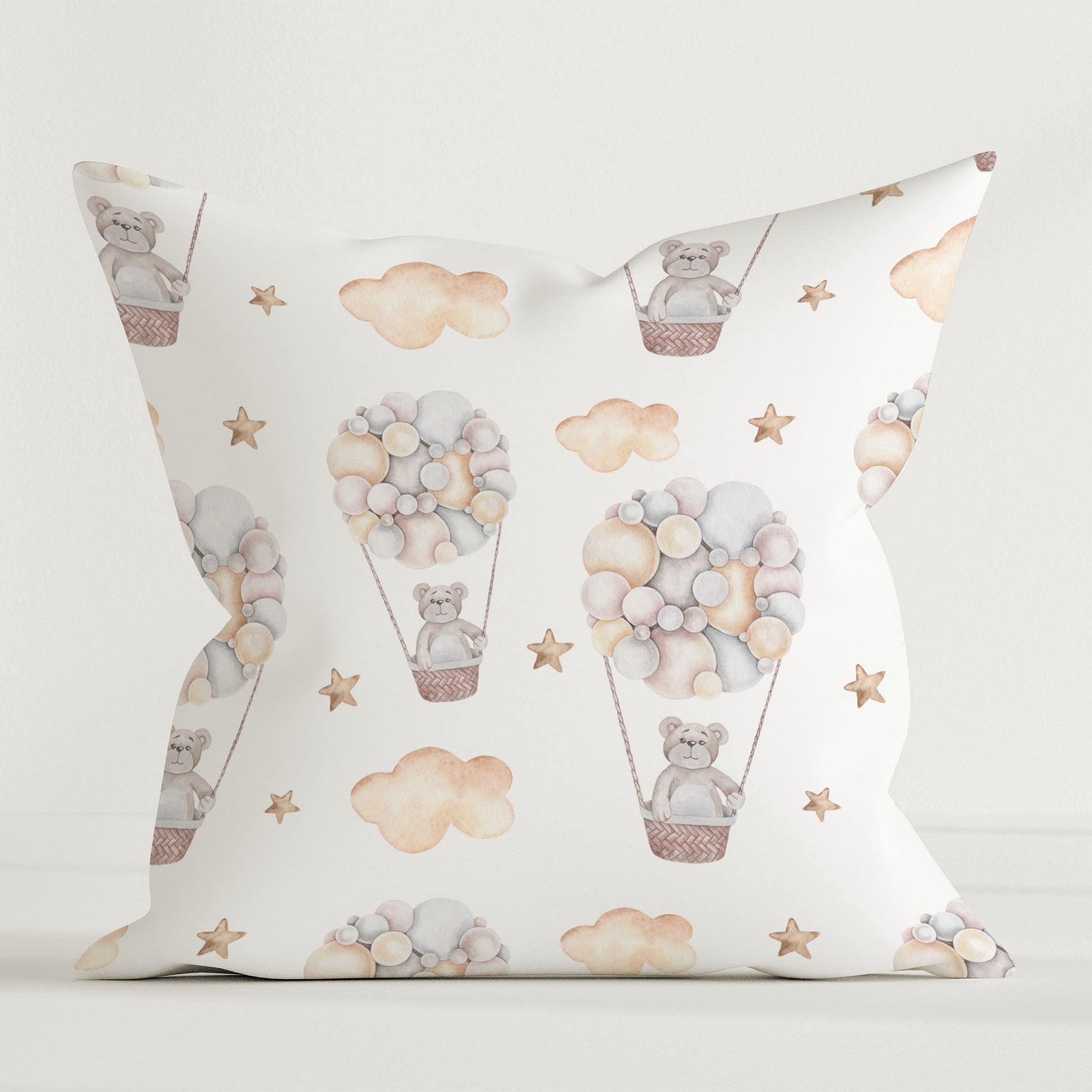 Über den Wolken: Mit sanften Farbtönen und einem bezaubernden Bär / Heißluftballon-Design, lädt dieses Kissen kleine Abenteurer ein, von fernen Ländern und atemberaubenden Höhenflügen zu träumen. Dieser robuste und maschinenwaschbare Kissenbezug ist bereit für jedes Kinderzimmer-Abenteuer und bleibt stets in Bestform.