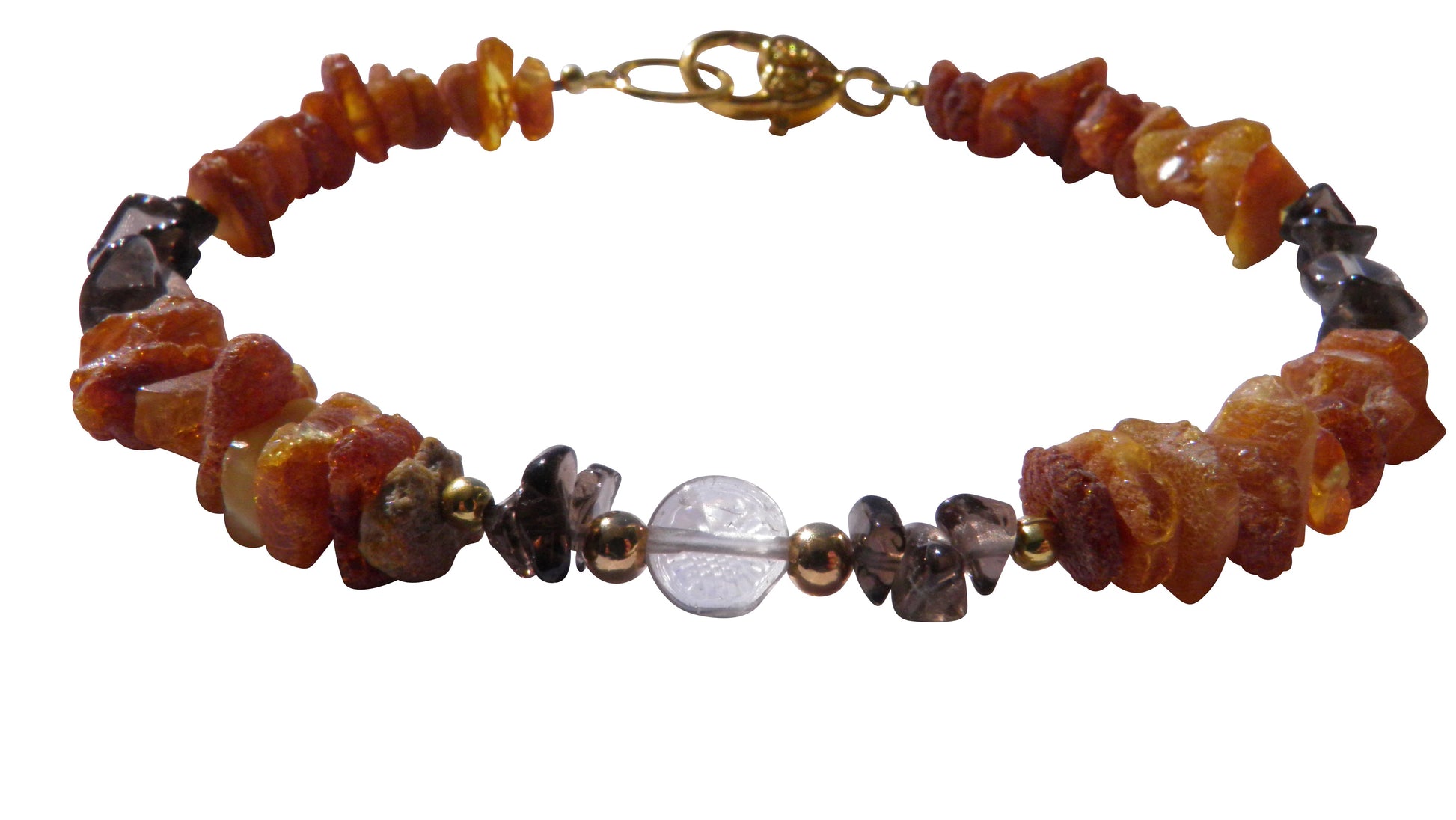 Material: Bernstein, Rauchquarz, goldfarbene Schmuckperlen, Schmuckdraht