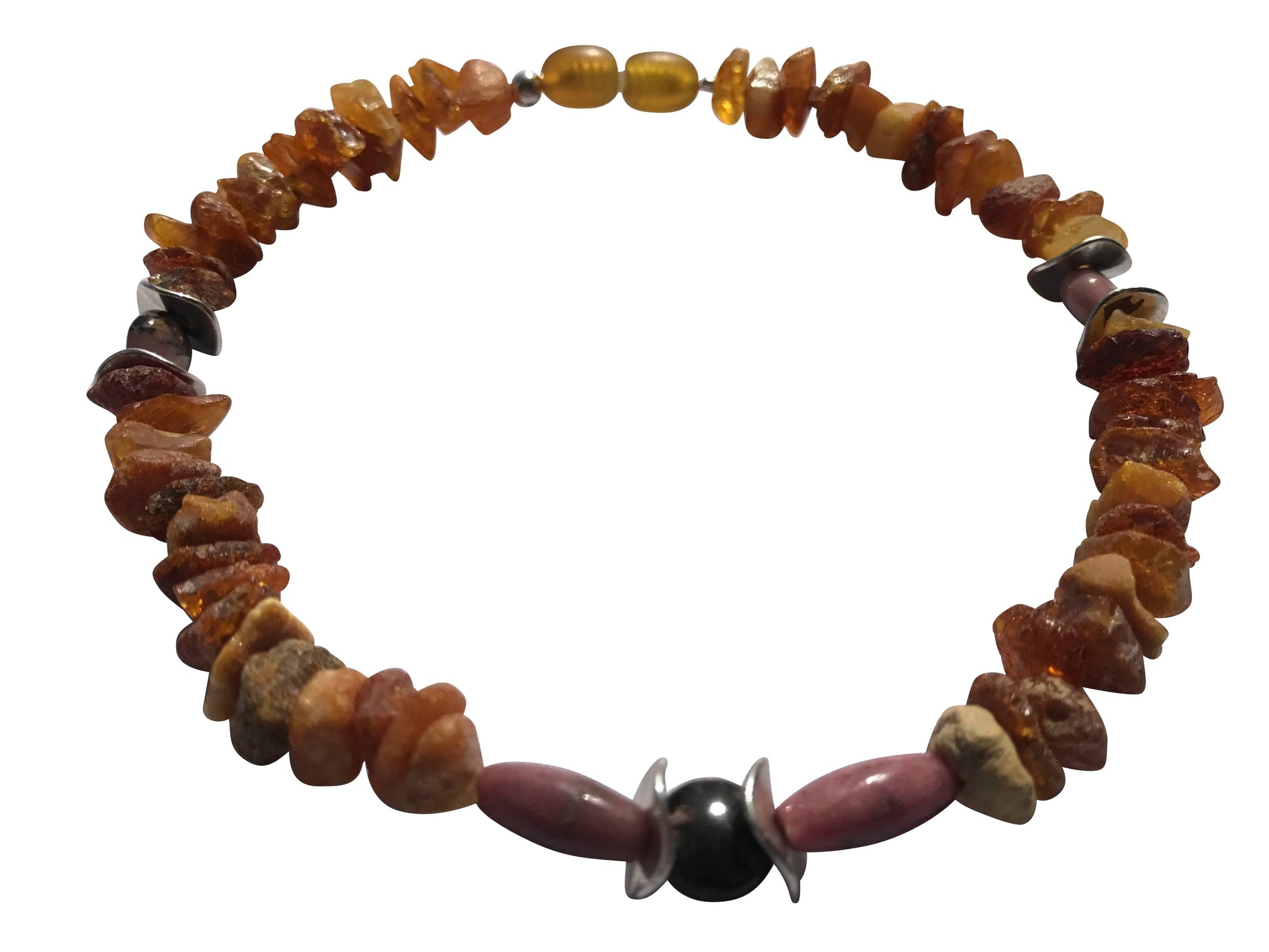 Material: Echter baltischer Bernstein, Rhodonit, Schmuckdraht, Zwischenteile