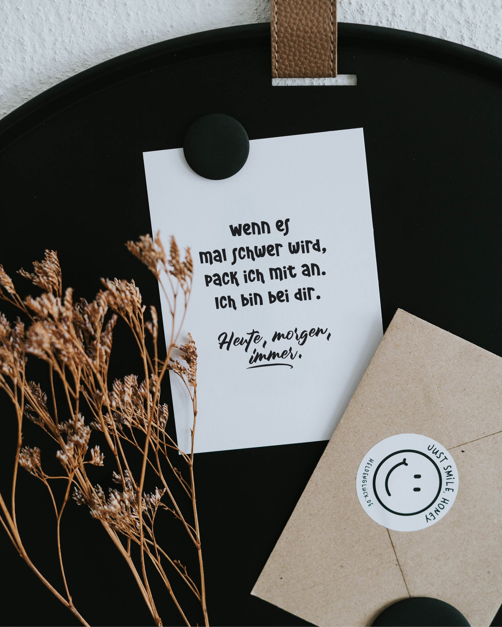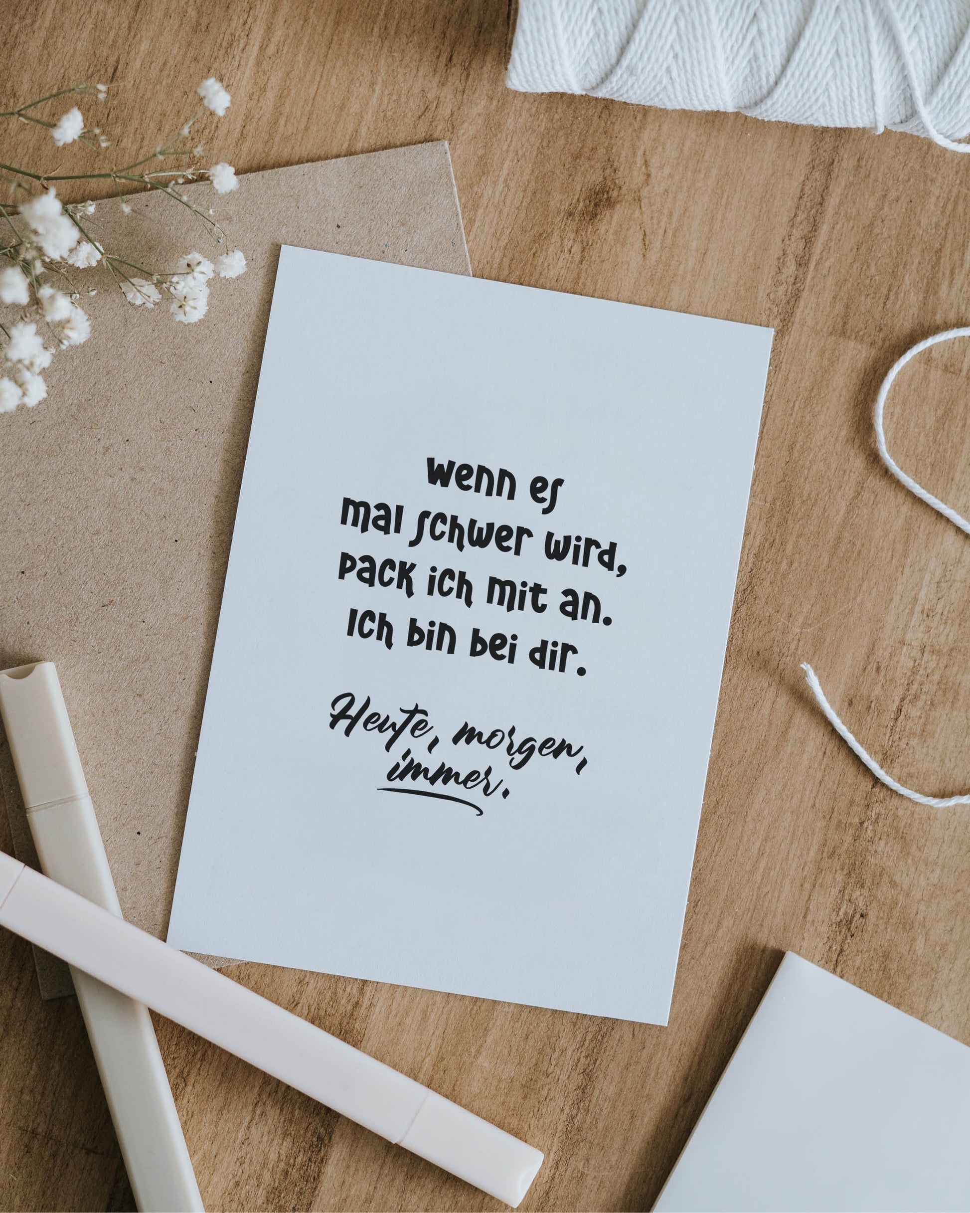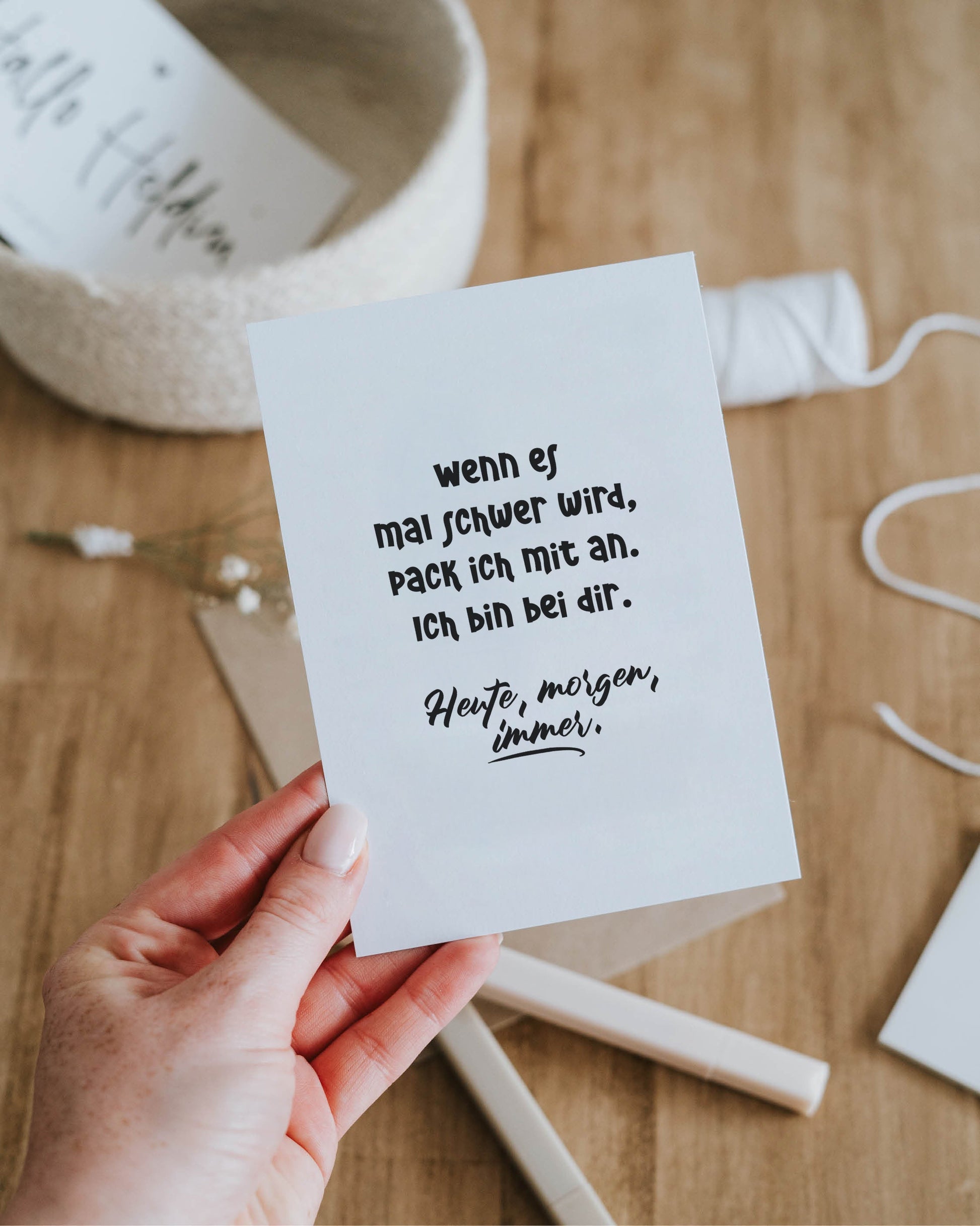 Worte fehlen oft – aber diese Karte spricht genau das aus, was zählt: „Ich bin da.“ Der warme, klare Spruch sagt ohne Umschweife, dass man nicht allein ist. Als kleine Geste im Alltag, zum Mutmachen oder einfach nur, um jemandem die Schulter zu reichen – diese Postkarte schafft Verbindung, wenn sie am meisten gebraucht wird.
