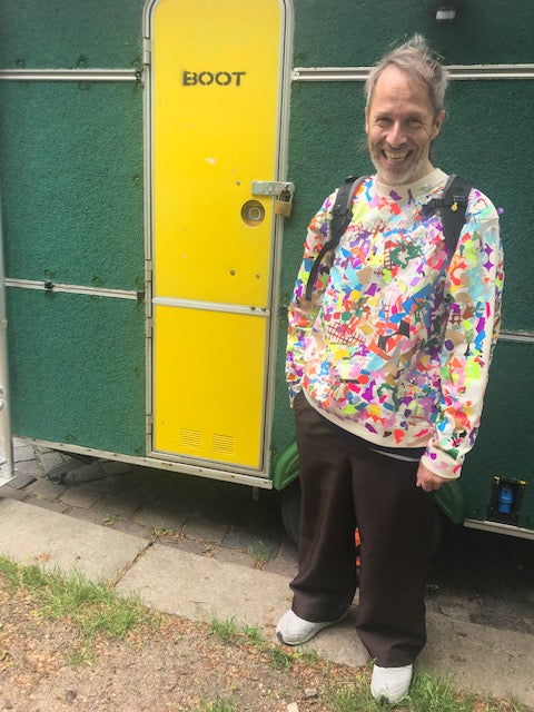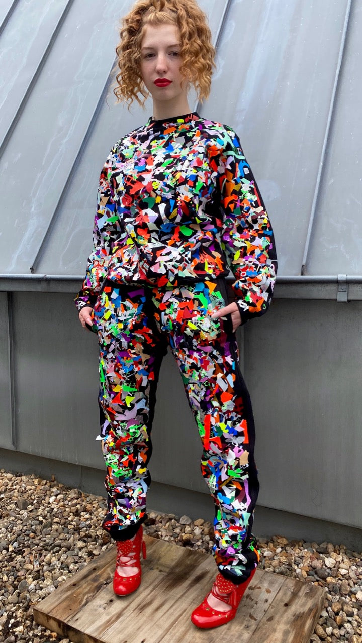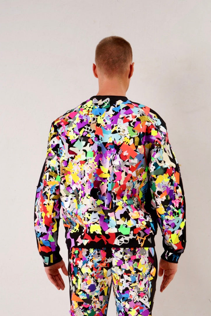 Comfy unisex sweater with loads of foil pieces with loose ends all over. The layered pieces of foil - made from leftovers - create a second and third layer on top of the sweater.