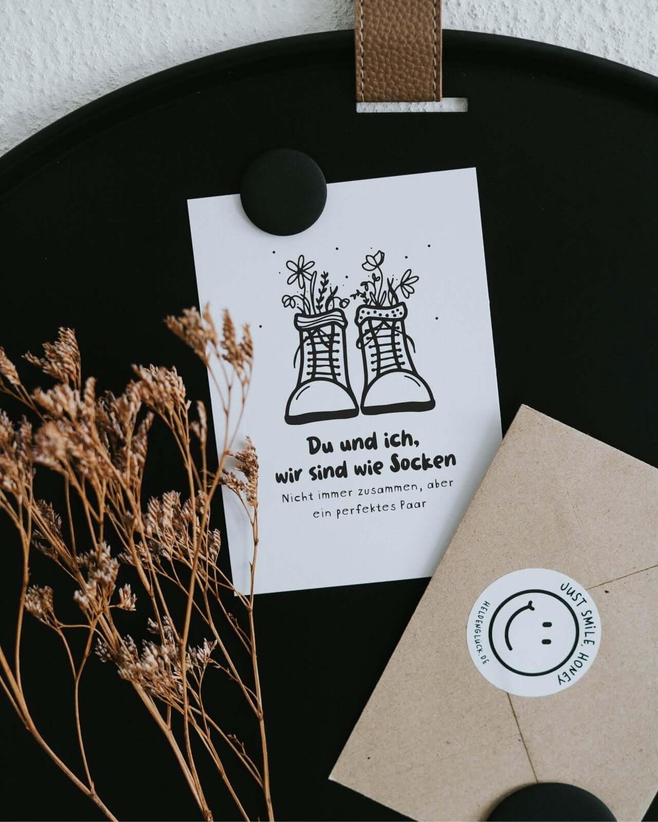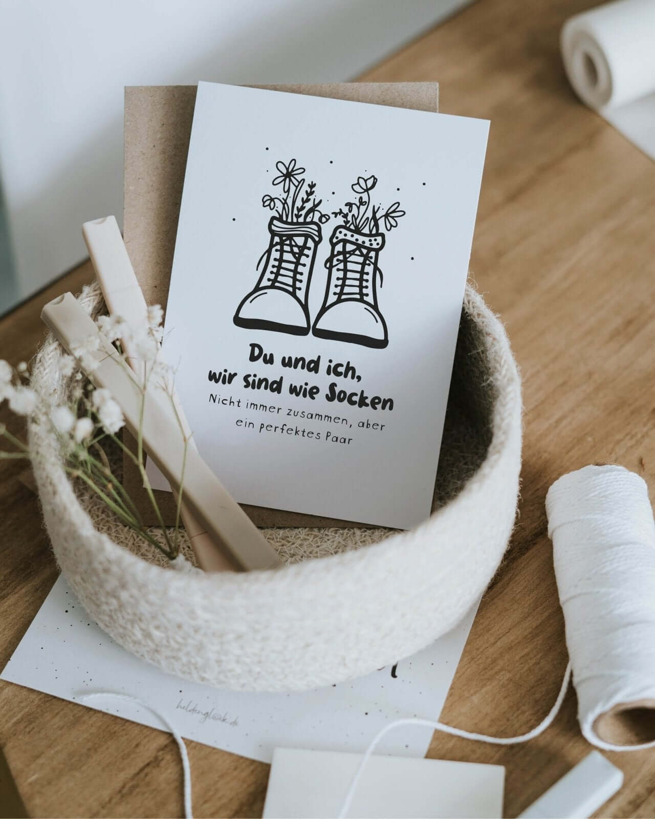Stell dir vor, dein Lieblingsmensch bekommt diese Karte – liest den Spruch „Du und ich, wir sind wie Socken …“ – und muss sofort schmunzeln. Eine charmante, ehrliche Botschaft, die zeigt: Zusammen passt ihr einfach. Ob für deine Partnerin, deinen besten Freund oder deine Lieblingskollegin – diese Postkarte ist ein liebevolles Geschenk mit Augenzwinkern. Viele Heldenglück-Kund:innen verschenken sie genau deshalb: weil sie verbindet, aufheitert und ein kleines Stück Glück mitbringt. Nachhaltig produziert, hochwertig gedruckt und mit Gefühl designt – so geht modernes Schenken.