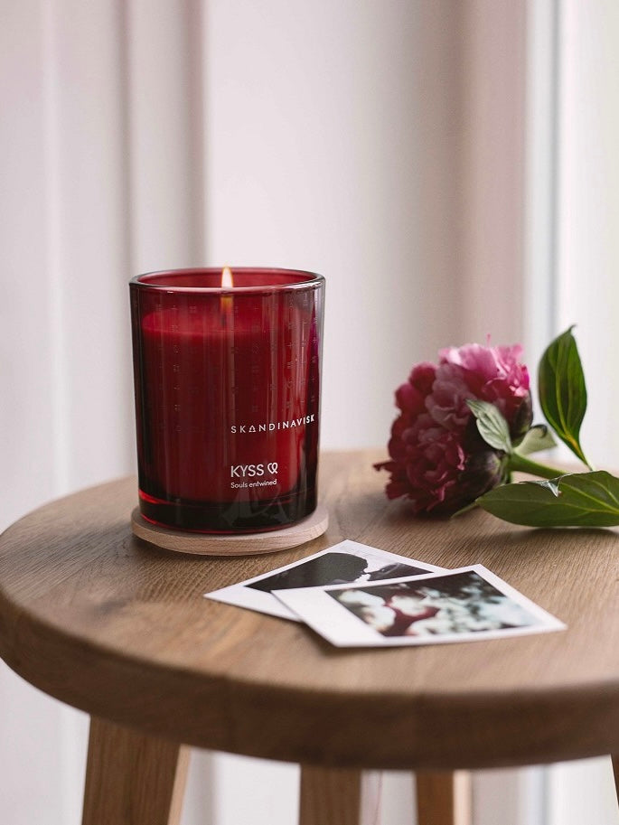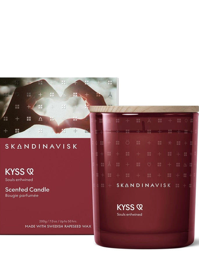 Duftkerze, hergestellt aus Wachs aus nachhaltiger, schwedischer Rapssaat mit Baumwolldocht und mit natürlichen Geruchsstoffen. Kyss ist schwedisch und norwegisch für Kuss. Beschenke deine Liebsten mit einem symbolischen Kuss. Wohltuende Duftnoten von Brombeeren, Rosen, Nelken und Candy im dekorativen, bemaltem Glasgefäß mit Buchenholzdeckel. Dekorative Verpackung, ideal auch zum Verschenken.