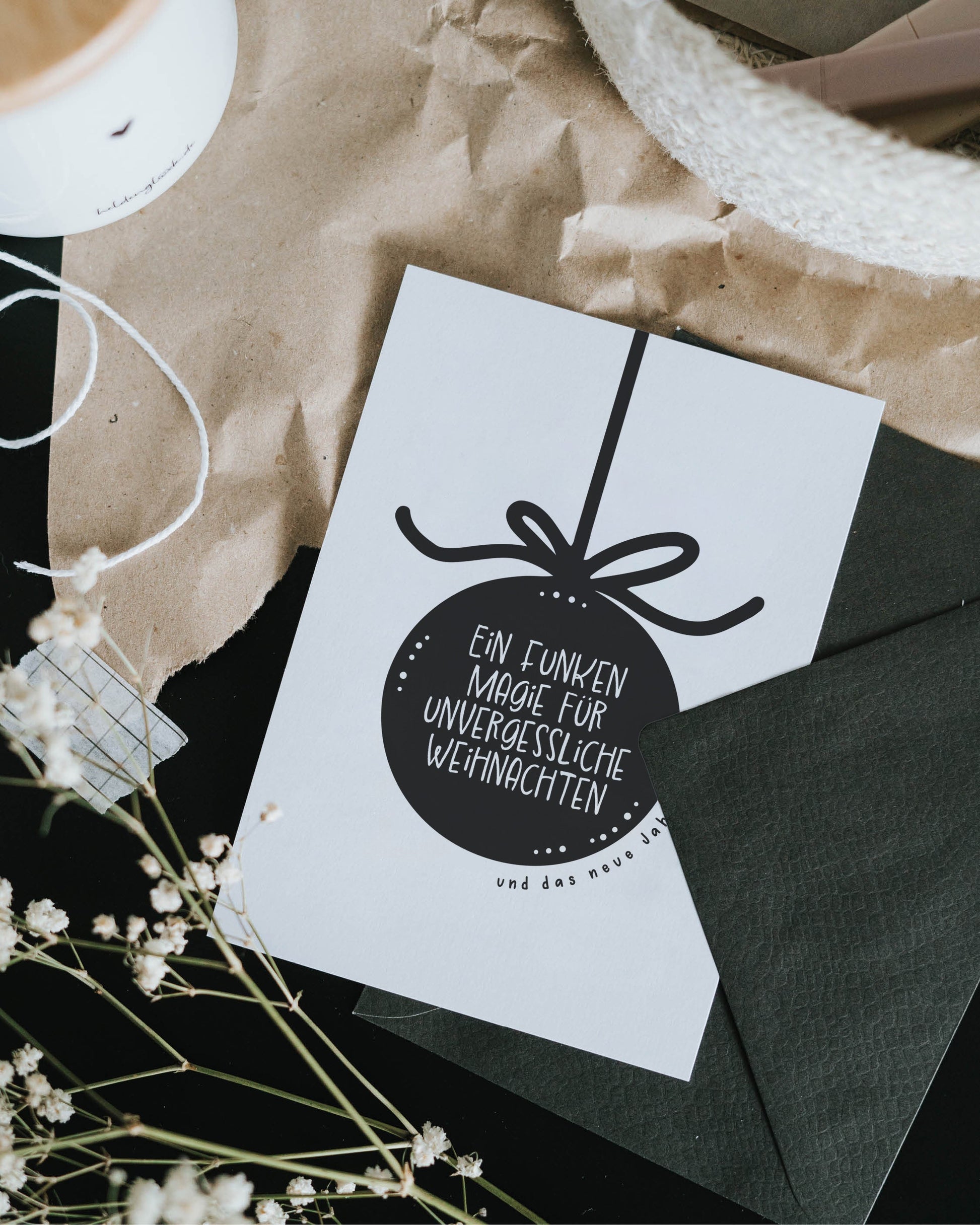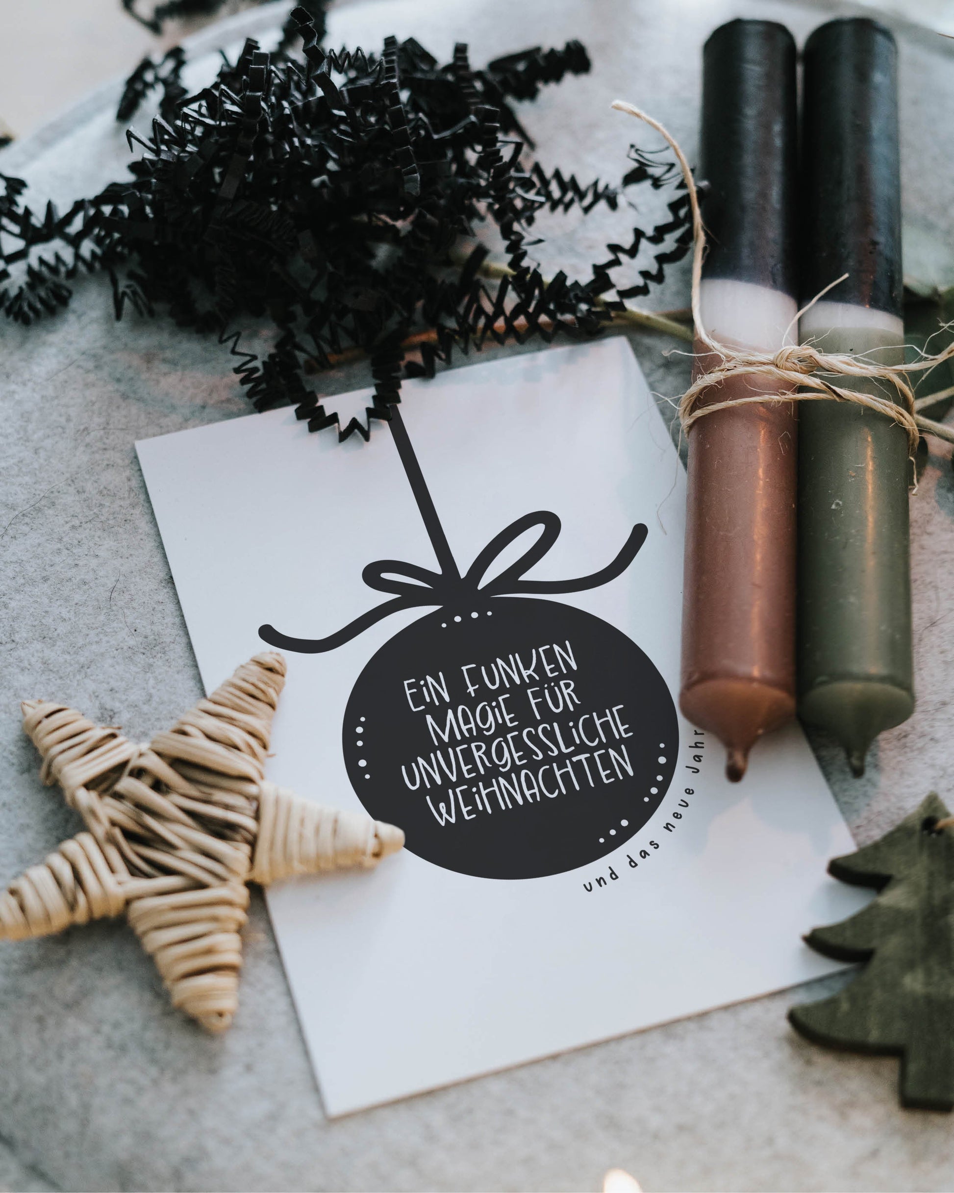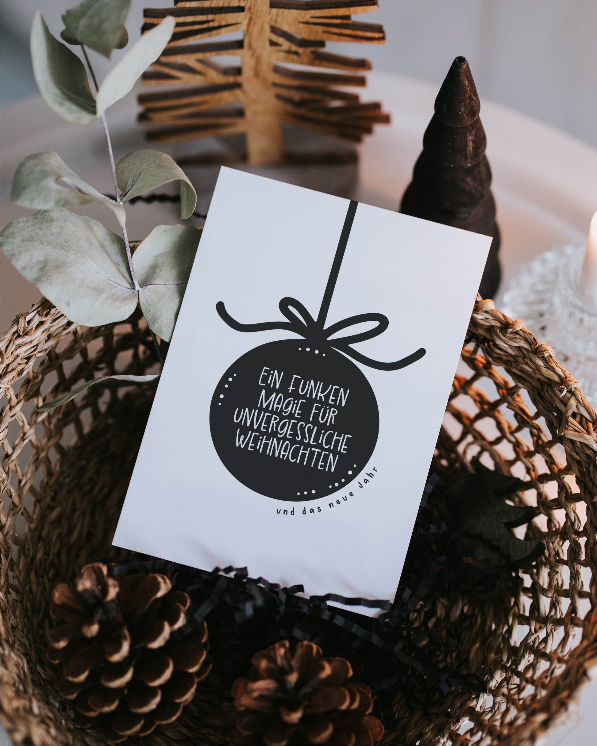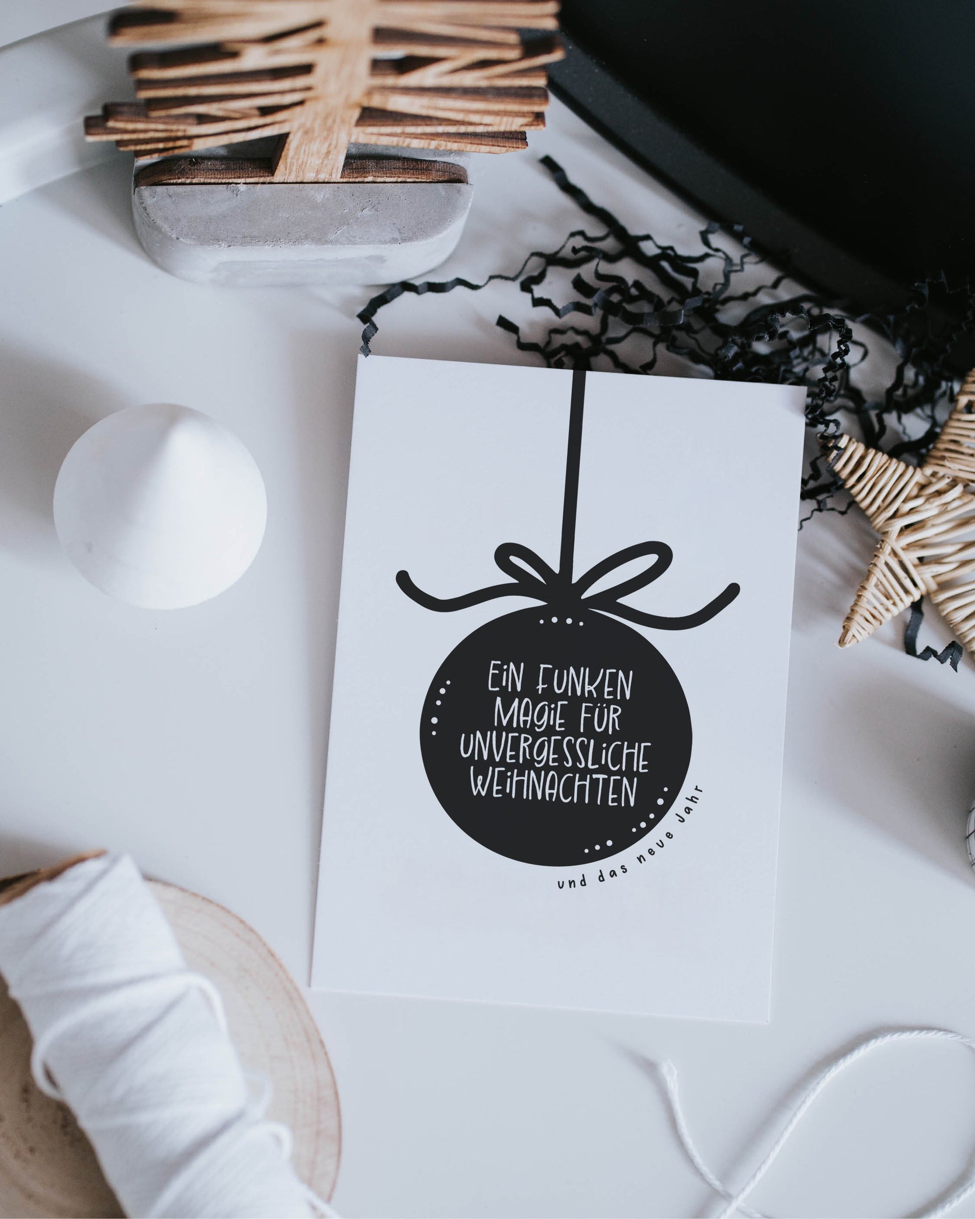 Diese Postkarte verbindet klare Gestaltung mit festlicher Stimmung. Der Spruch „Ein Funken Magie für unvergessliche Weihnachten und das neue Jahr“ steht im Mittelpunkt – eingerahmt von einer stilisierten Weihnachtskugel, die sanft von oben herabhängt. Ein schlichtes, elegantes Design, das Weihnachtszauber ohne Übertreibung transportiert. Perfekt für alle, die stilvoll, aber herzlich grüßen möchten.
