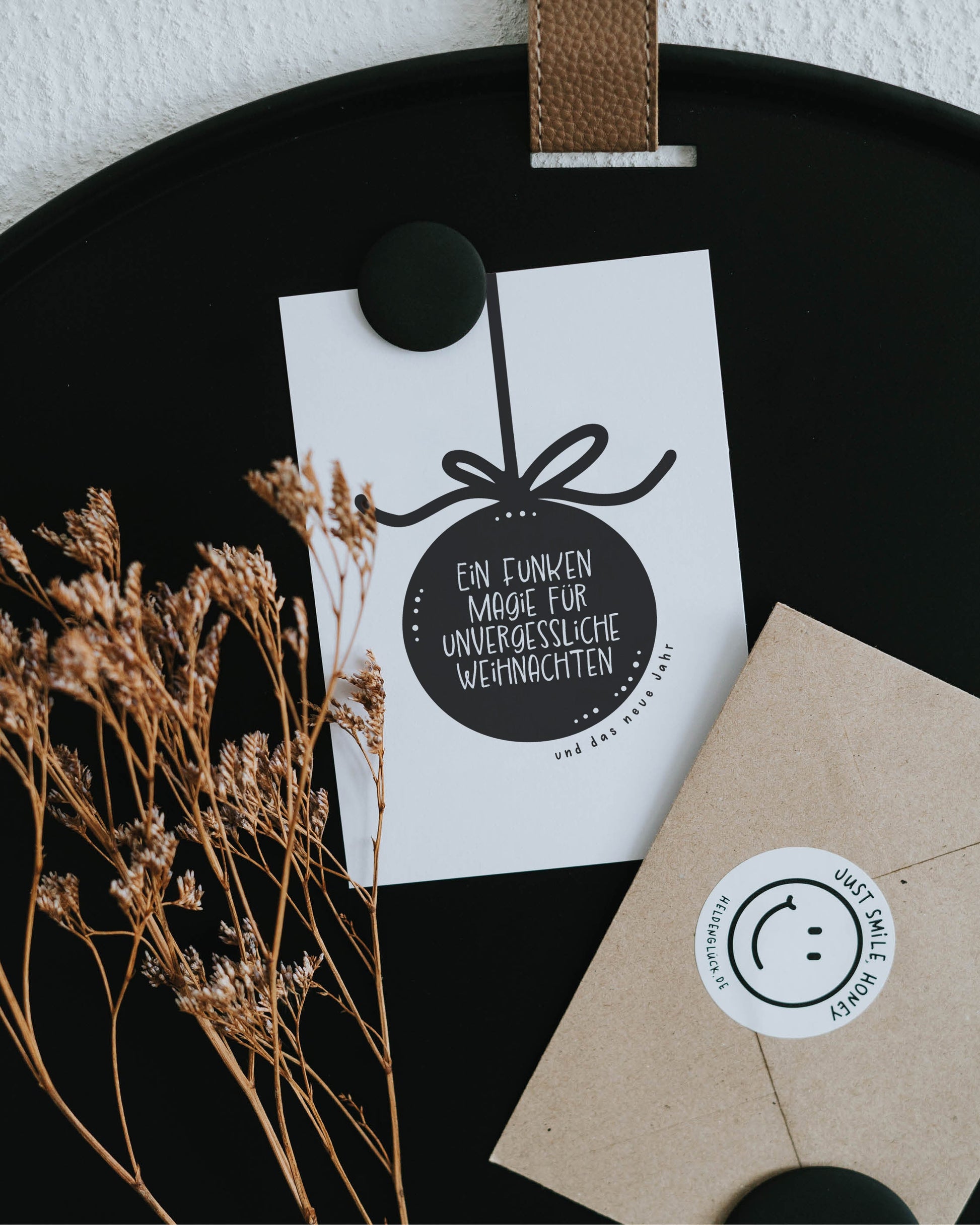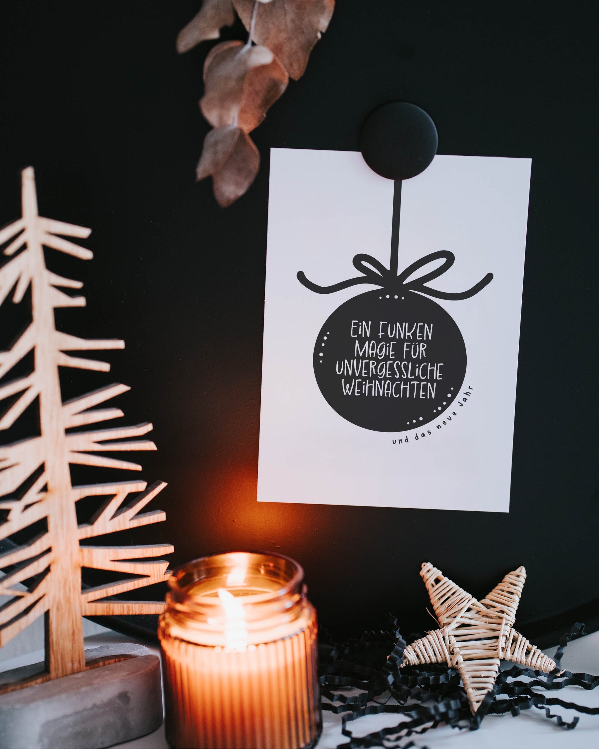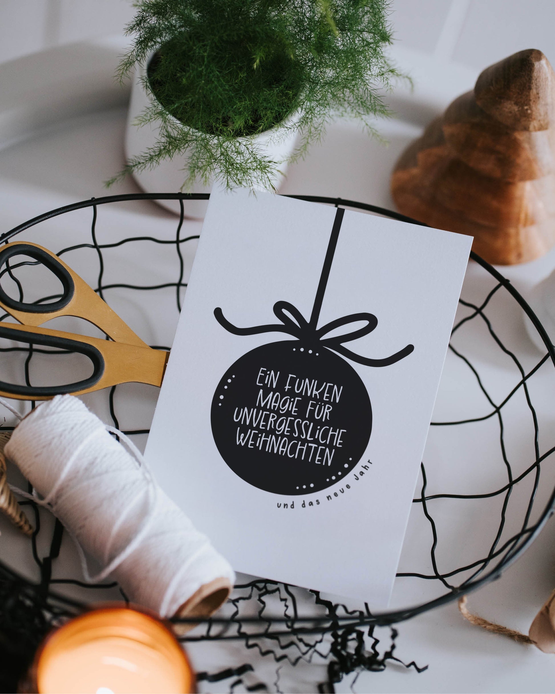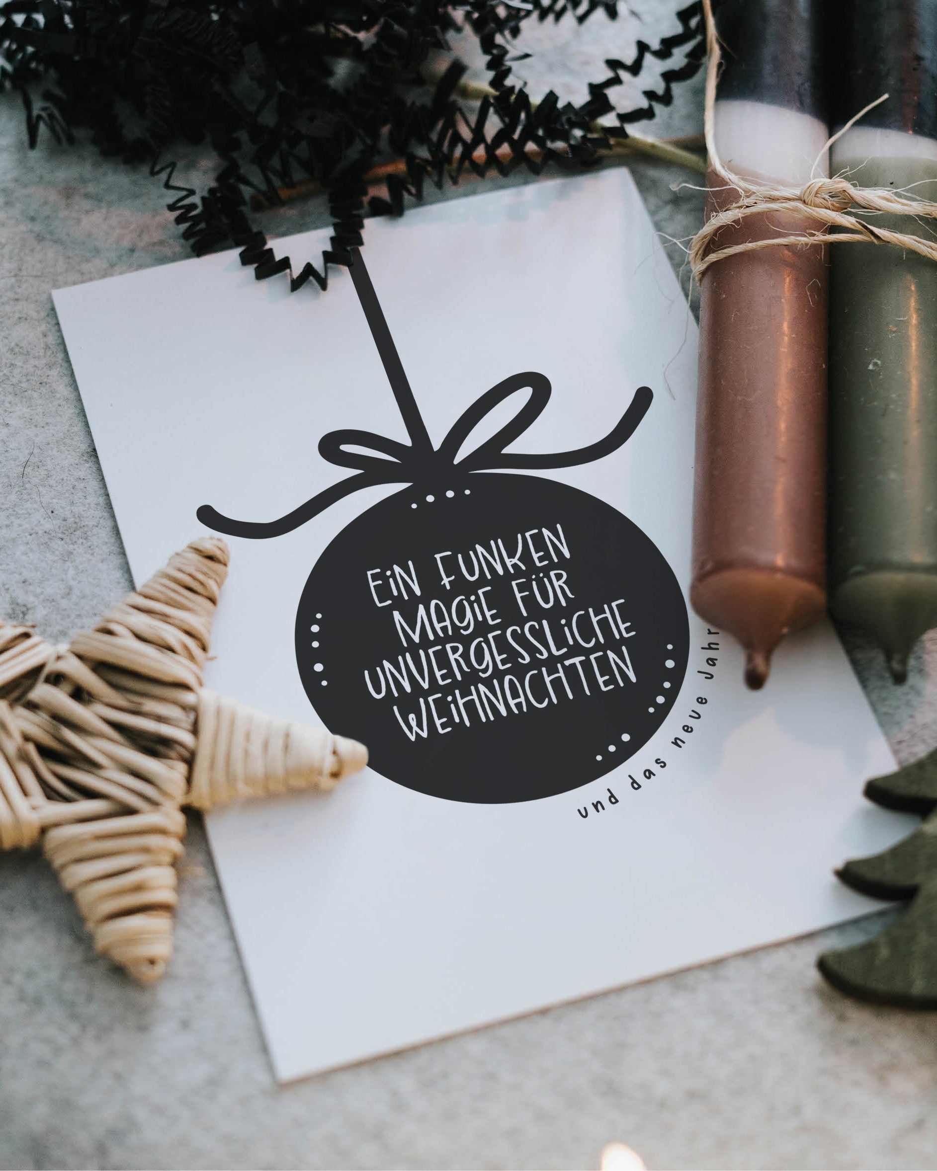 Diese Postkarte verbindet klare Gestaltung mit festlicher Stimmung. Der Spruch „Ein Funken Magie für unvergessliche Weihnachten und das neue Jahr“ steht im Mittelpunkt – eingerahmt von einer stilisierten Weihnachtskugel, die sanft von oben herabhängt. Ein schlichtes, elegantes Design, das Weihnachtszauber ohne Übertreibung transportiert. Perfekt für alle, die stilvoll, aber herzlich grüßen möchten.