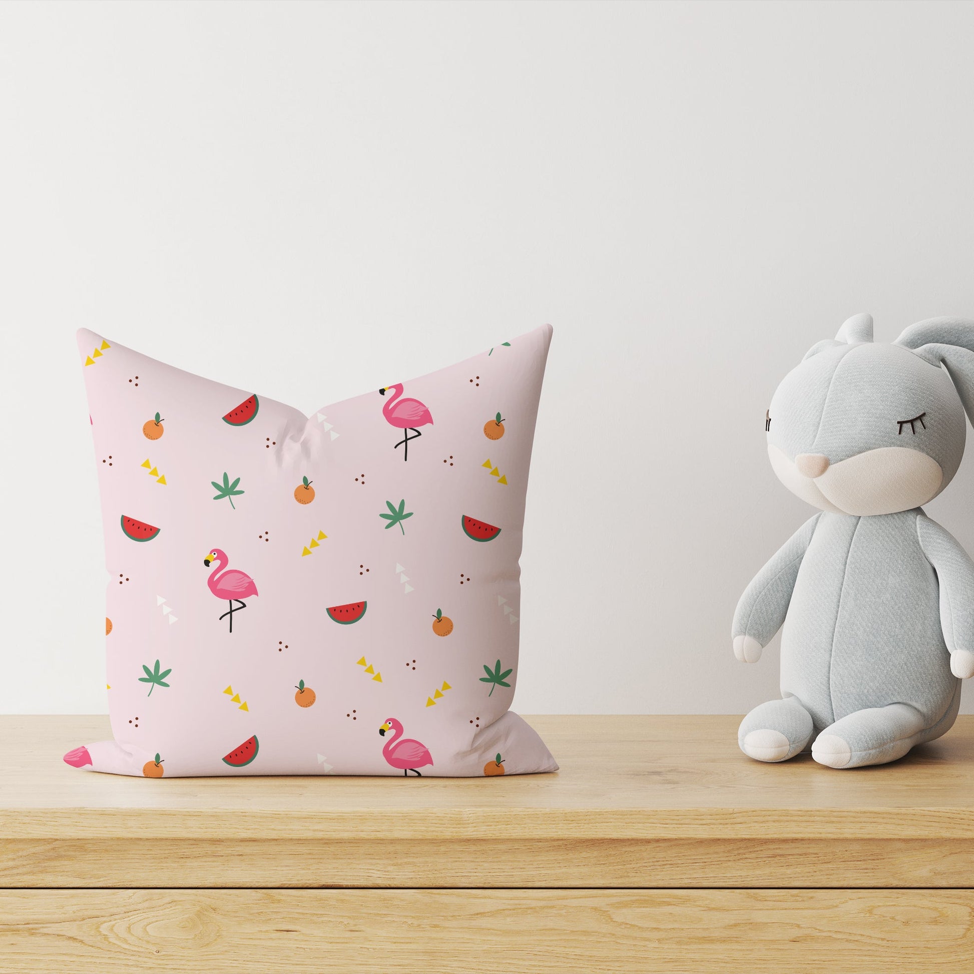 Mit seinem fröhlichen Flamingo-Design bringt dieses Dekokissen sofort Sommerstimmung ins Kinderzimmer. Die liebevollen Illustrationen mit Wassermelone, Früchten und Palmen machen aus jedem Bett, Kuschel- oder Leseplatz ein kleines Paradies.