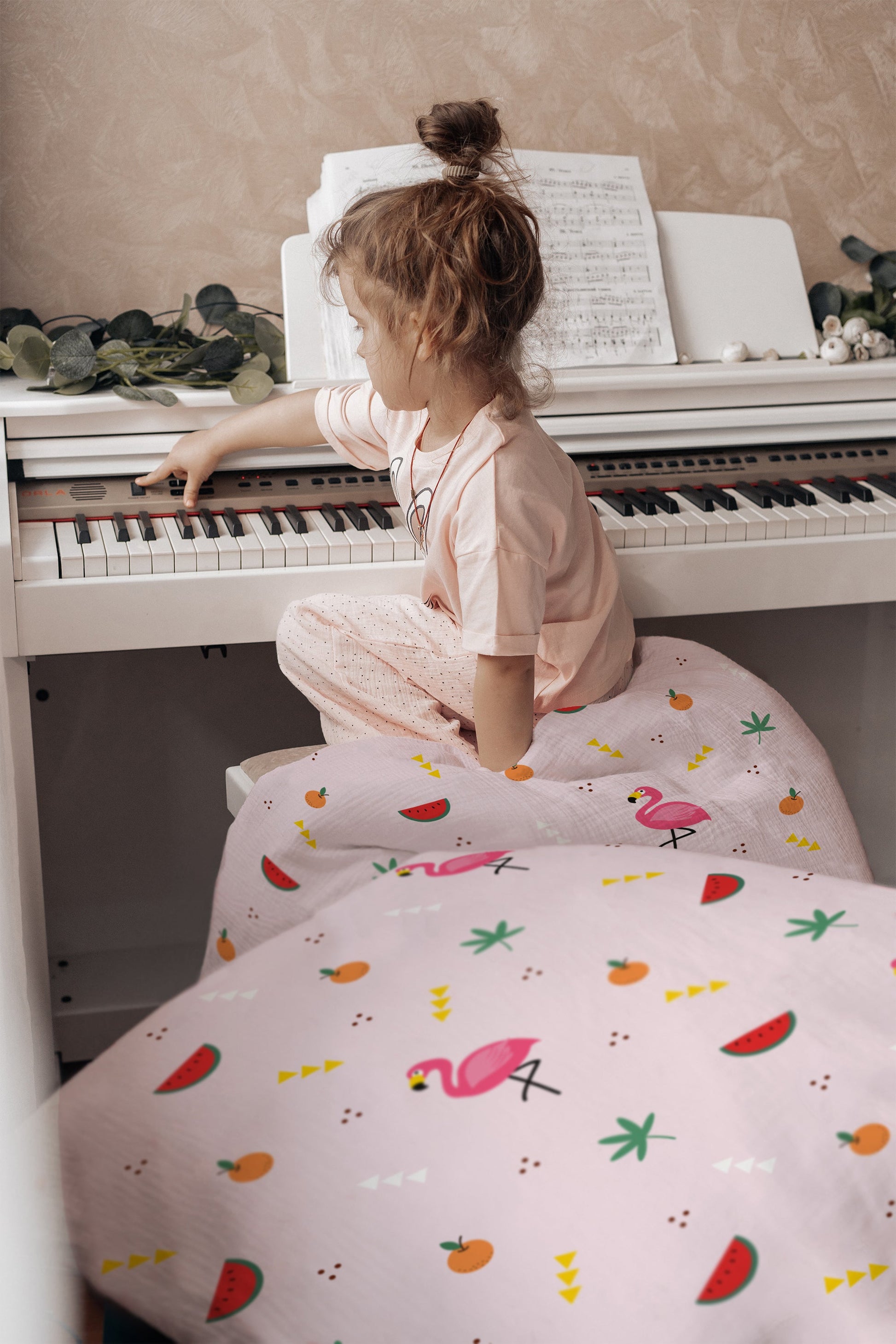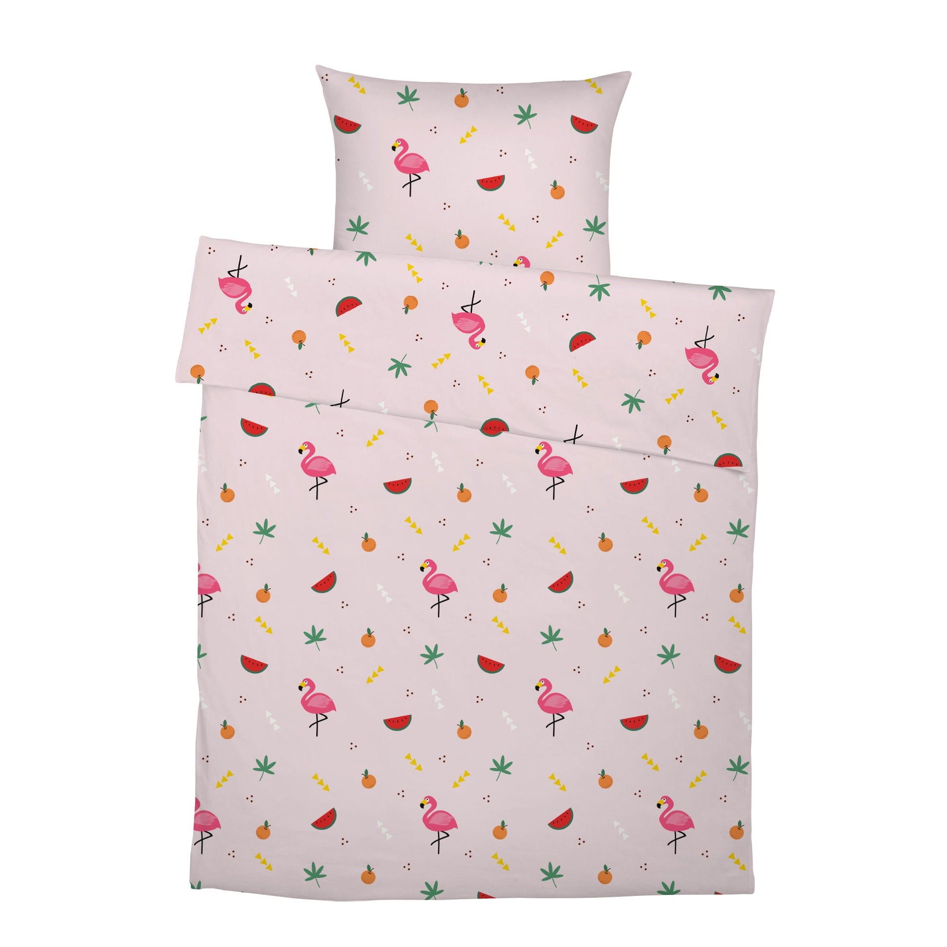 Lustige Flamingos, Wassermelonen und kleine Früchte tanzen auf zartem Rosa – dieses Design bringt pure Sommerlaune ins Kinderzimmer! Die liebevollen Illustrationen machen jede Nacht zum kleinen Urlaub.