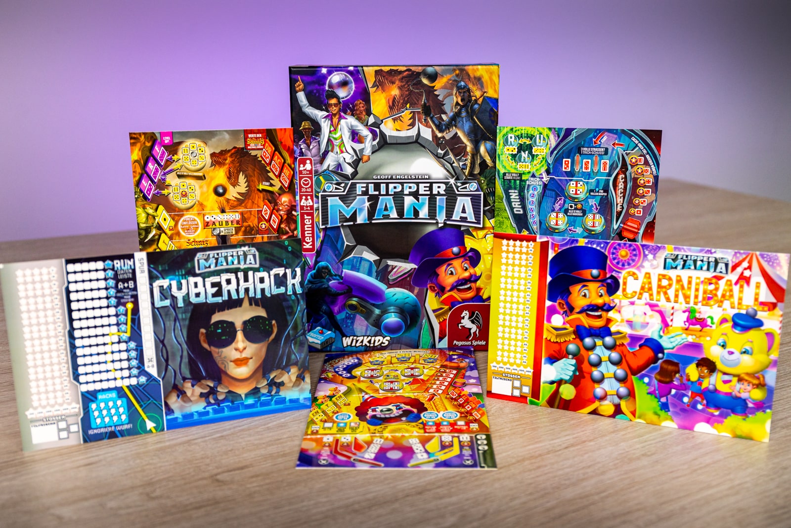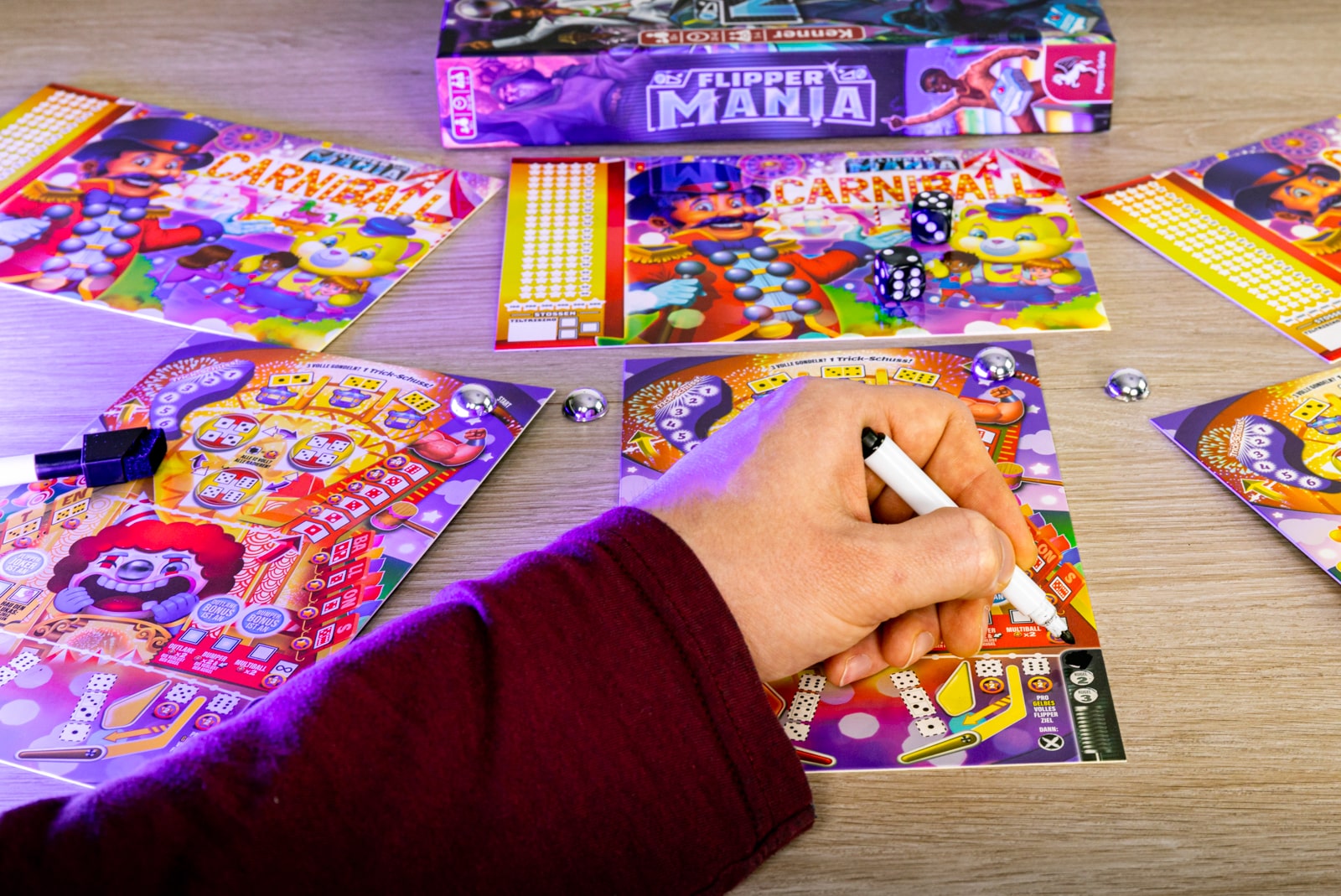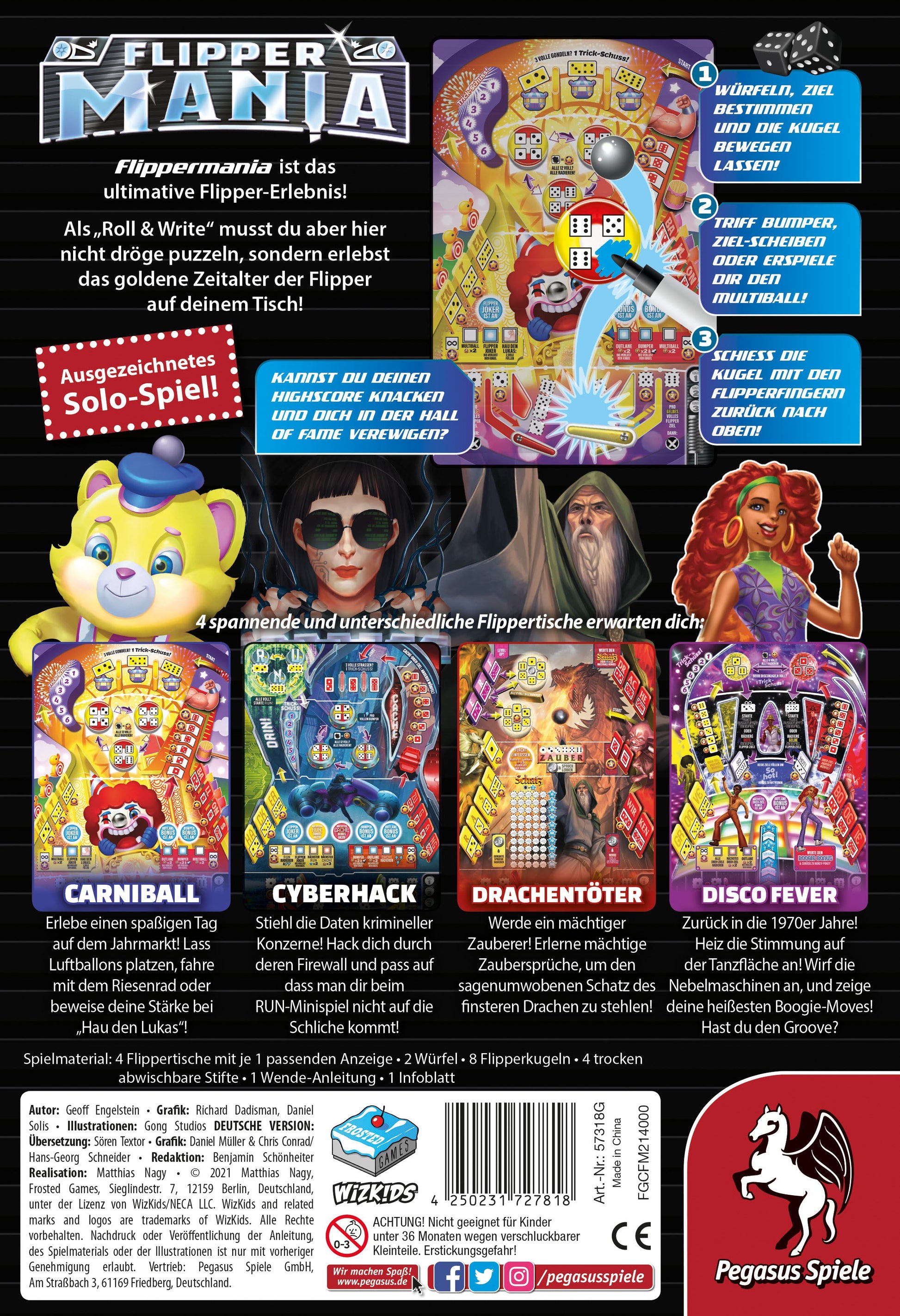 Flippermania bringt die Aufregung aus den Flipper-Spielhallen auf den Spieltisch – ganz ohne schnelle Reflexe! Die Spielenden jonglieren den Ball zwischen den Bumpern, treffen Drop Targets ab, schalten Skill Shots frei, aktivieren den Multiball und spielen nebenher sogar einige Minispiele auf dem Backglass. Der Ball ist fast raus? Da kann es manchmal helfen, den Tisch ein bisschen „anzustupsen“, aber nur nicht zu sehr kippen! Ob alleine auf der Jagd nach dem nächsten Highscore oder simultan mit mehren Spielenden, wobei alle die gleichen Würfel und Automaten zur Verfügung haben – so thematisch war ein Roll&Write noch nie! Die vier verschiedenen Spielpläne bringen dabei jeweils eigene Herausforderungen und Boni mit sich.
