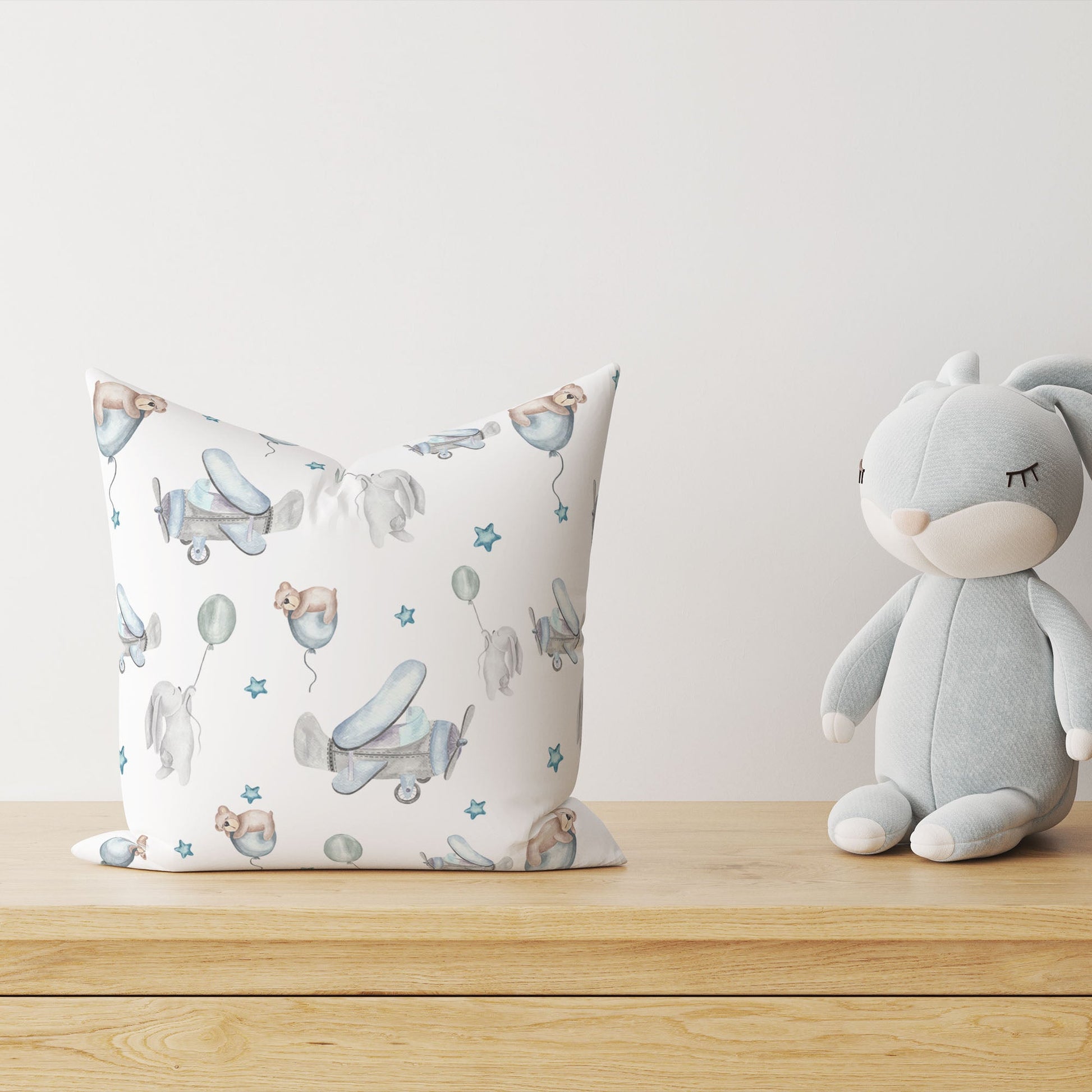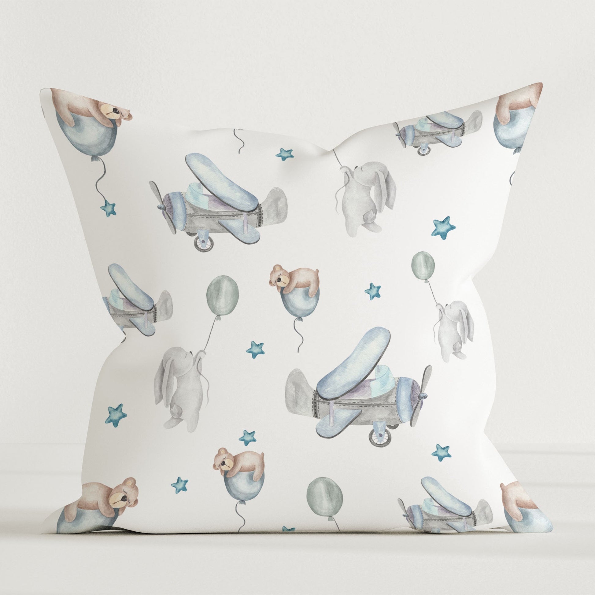Flugzeuge, Hasen, Luftballoons: Entdecke unser süßes Dekokissen, das mit kinderfreundlichen Aquarell-Farben gestaltet ist und deine Kleinen in ihren schönsten Träumen begleitet. Gefertigt aus zertifizierter Baumwolle unserer vertrauenswürdigen Partner, verspricht es nicht nur wunderbare Träume, sondern auch höchste Qualität und Sicherheit für dein Kind. Perfekt für junge Eltern, die Wert auf Stil und Wohlbefinden legen.