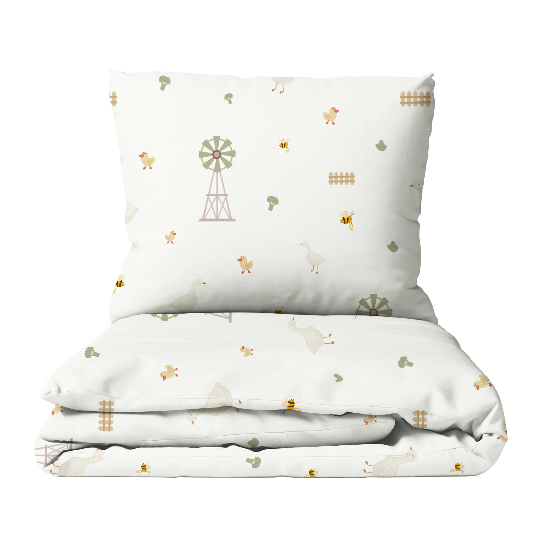 Bauernhof Romantik: Tauche ein in eine fröhliche Welt, in der süße Gänse, bunte Windräder und summende Bienchen das Bild bestimmen. Diese bezaubernde Bettwäsche aus Premium OEKO-Tex 100 zertifizierter Baumwolle sorgt für ein optimales Schlafklima und bietet deinem Kind eine atmungsaktive, weiche und sichere Schlafumgebung. Das liebevoll gestaltete Gänse-Design schenkt nicht nur kuschelige Nächte, sondern auch eine Welt voller kleiner Abenteuer und fröhlicher Geschichten. Perfekt für kleine Naturfreunde und neugierige Entdecker!
