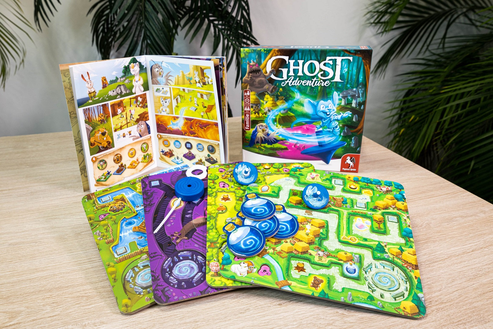 Im kooperativen Familienspiel Ghost Adventure führen die Spielenden einen sich drehenden Kreisel über mehrere Spielpläne und müssen auf ihnen Aufgaben erfüllen, um Missionen erfolgreich abzuschließen. Für jede der insgesamt 56 Missionen muss eine andere Route mit dem Kreisel absolviert werden. Die doppelseitigen Tafeln zeigen acht verschiedene Welten und eine Vielzahl an Zielen, die es zu erreichen gilt, ohne dass der Kreisel (zu oft) stehen bleibt.