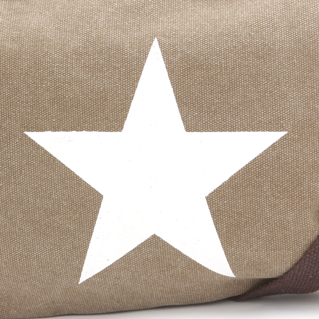 Modische Beuteltasche mit angesagtem Stern Motiv in braun mit braunen Lederaplikationen. Obermaterial Stoff mit Lederapplikationen, mit 3 Innentaschen, Reißverschluss, Tragegurt, Breite ca. 33 cm und Höhe ca.24, Innenfutter 100% Polyester, Made in Italy.