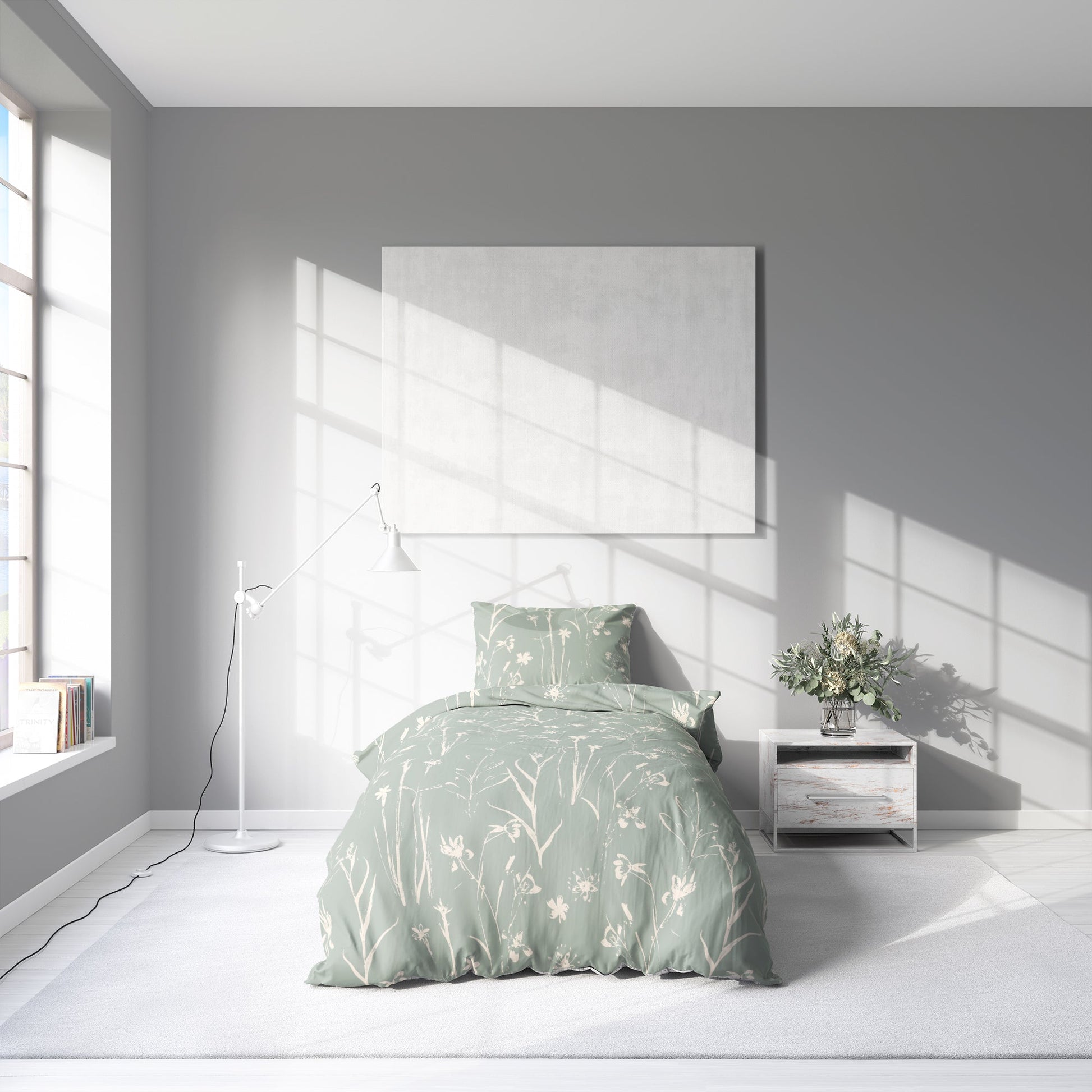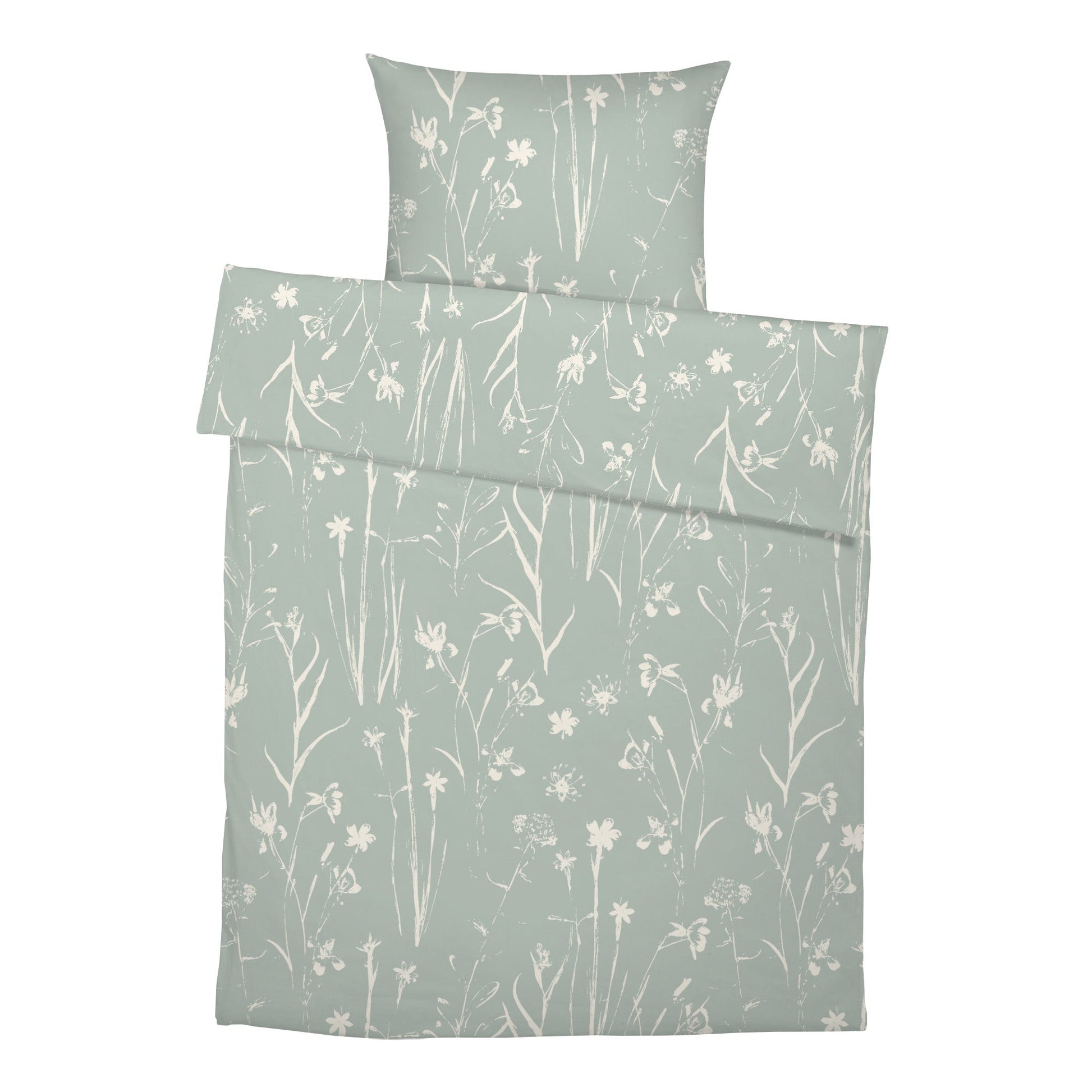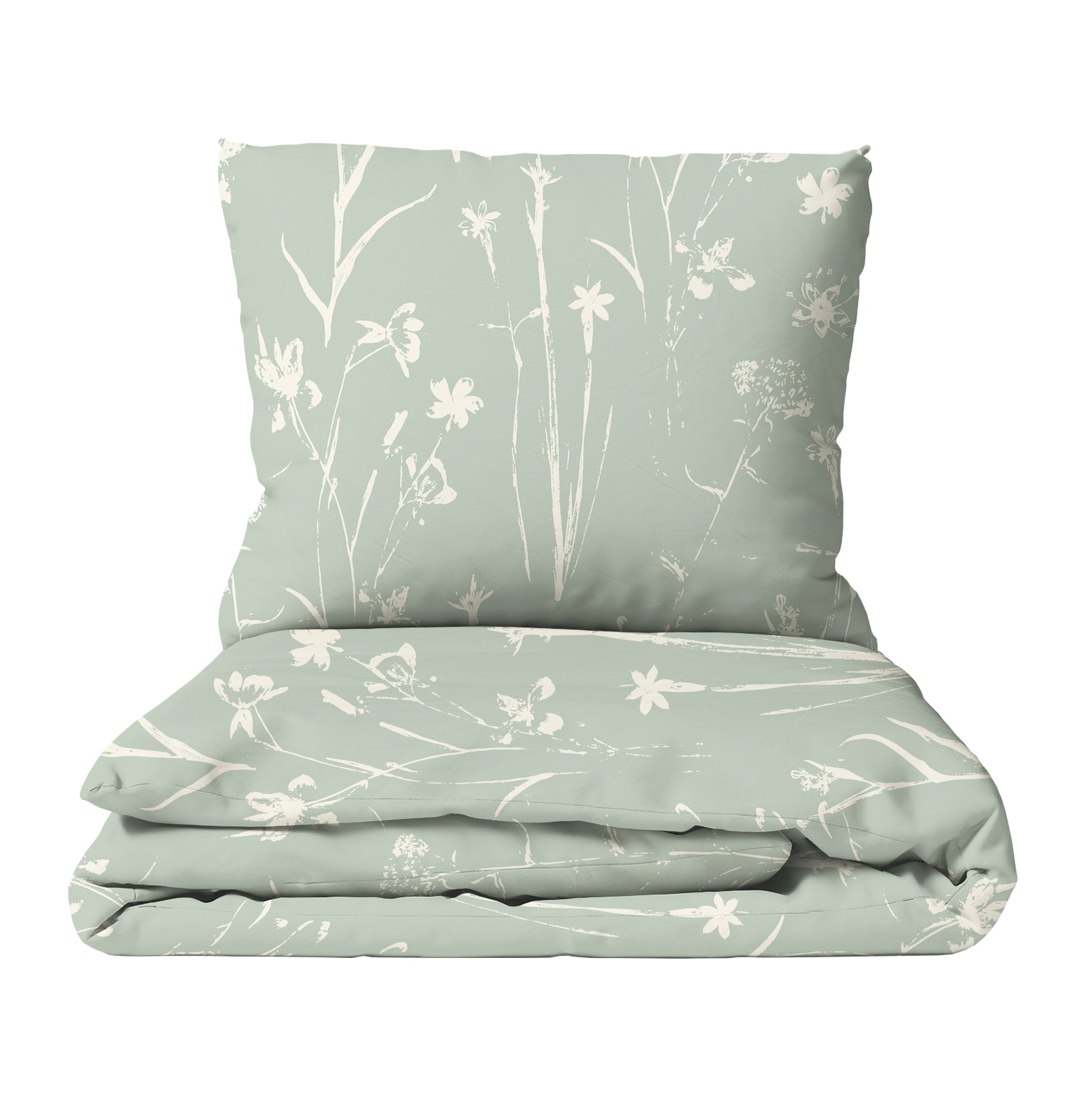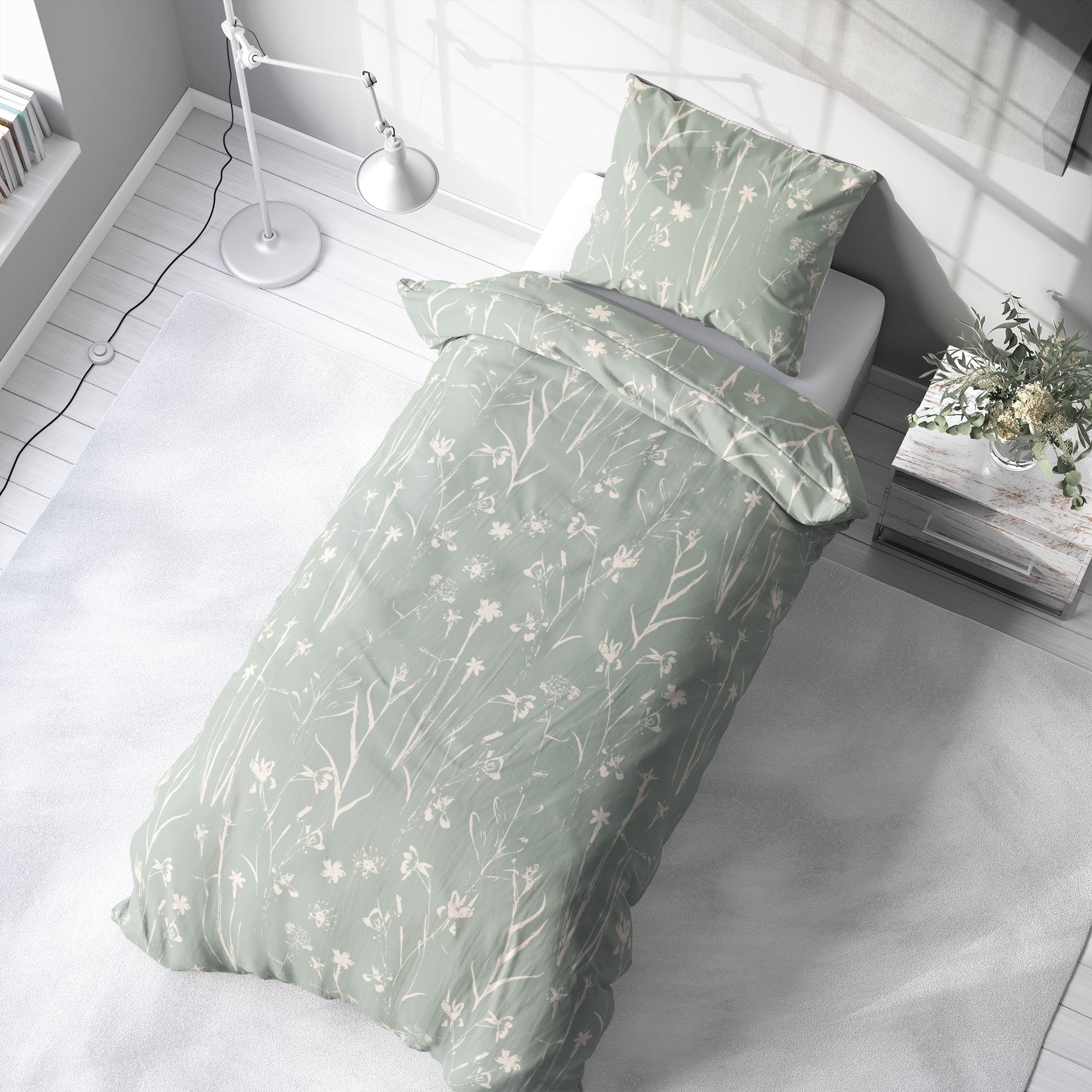 Boho-Charme trifft Natur: Die "Grüne Wiese" Bettwäsche von Leslis verkörpert mit ihrem einzigartigen Boho-Stil und den sanft beige getönten Blumen auf grünem Grund die Essenz der Freiheit und des Lebens im Einklang mit der Natur. Dieses Design fängt die unbeschwerte Ästhetik und die warmen Farbtöne des Bohème-Lebensgefühls ein und bringt eine lässig-elegante Atmosphäre in Ihr Schlafzimmer.
