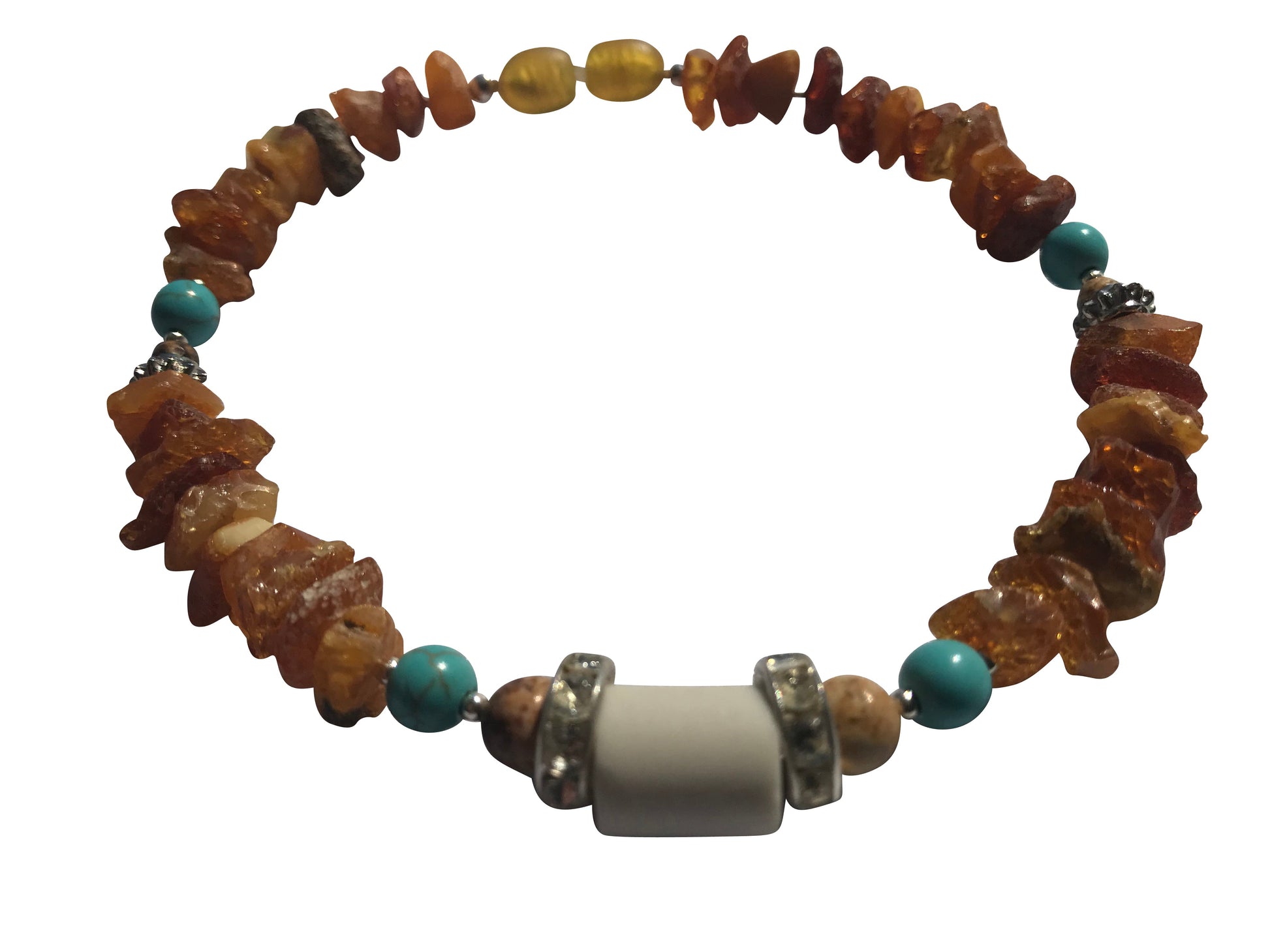 Materialien: Bernstein (Cognac, Gelb, Grün), EM-Keramik, Howlith, Landschaftsjaspis, Schmuckdraht