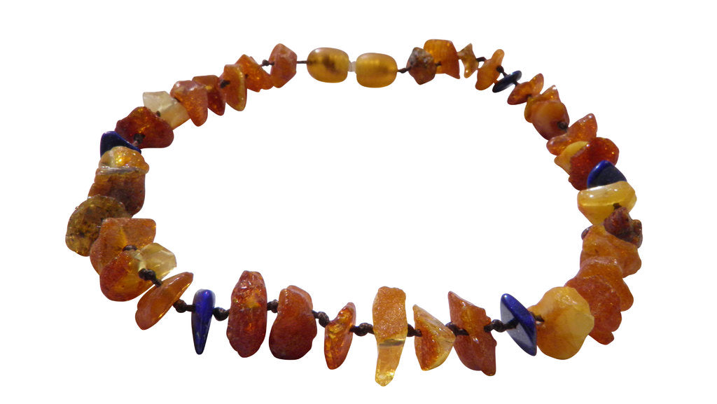 - Materialien: unbehandelter Bernstein (cognac/gelb) & echter Lapislazuli