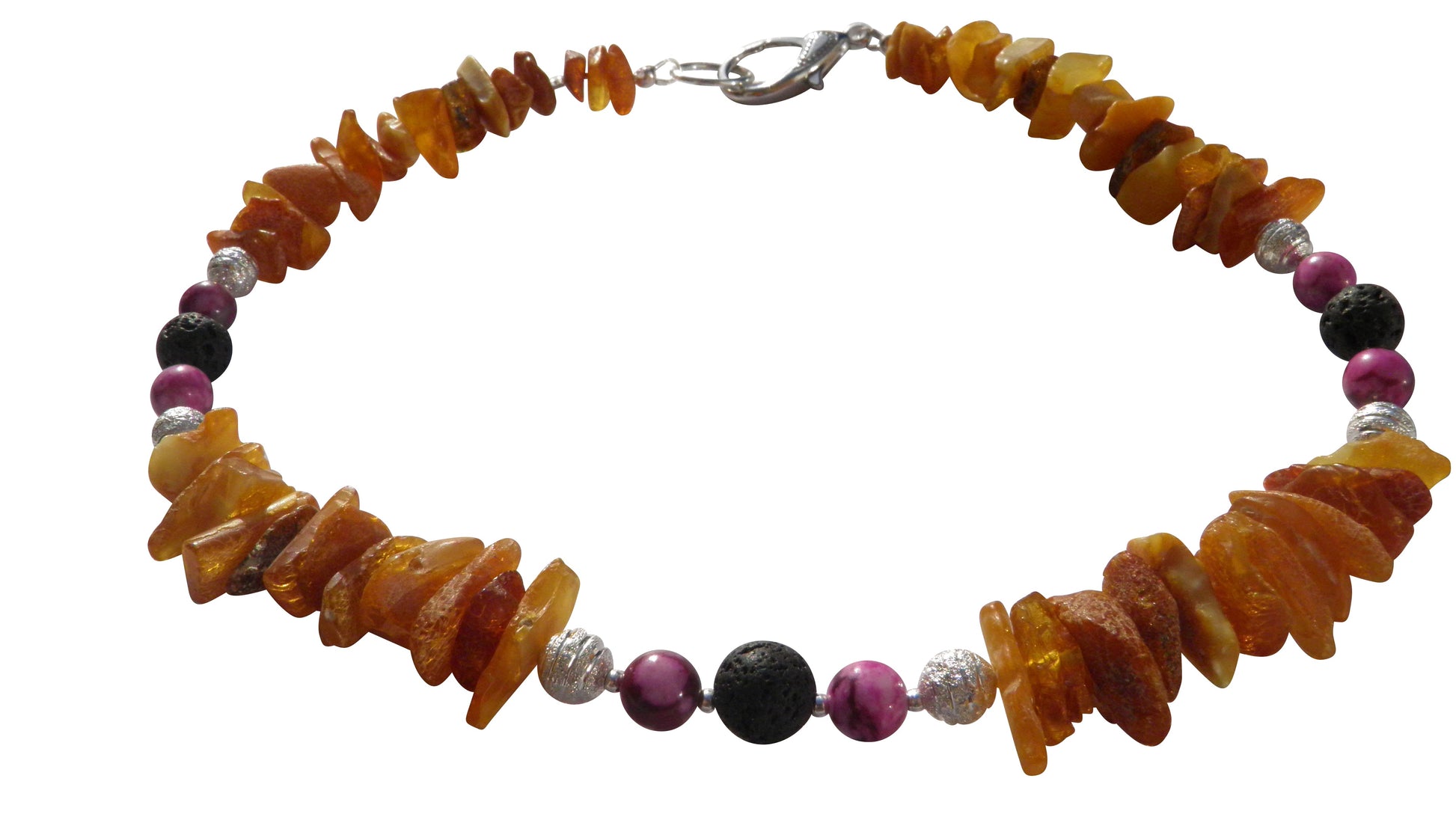 Material: Echter baltischer Bernstein, Sugilith, Lava, silberfarbene Schmuckperlen, Schmuckdraht