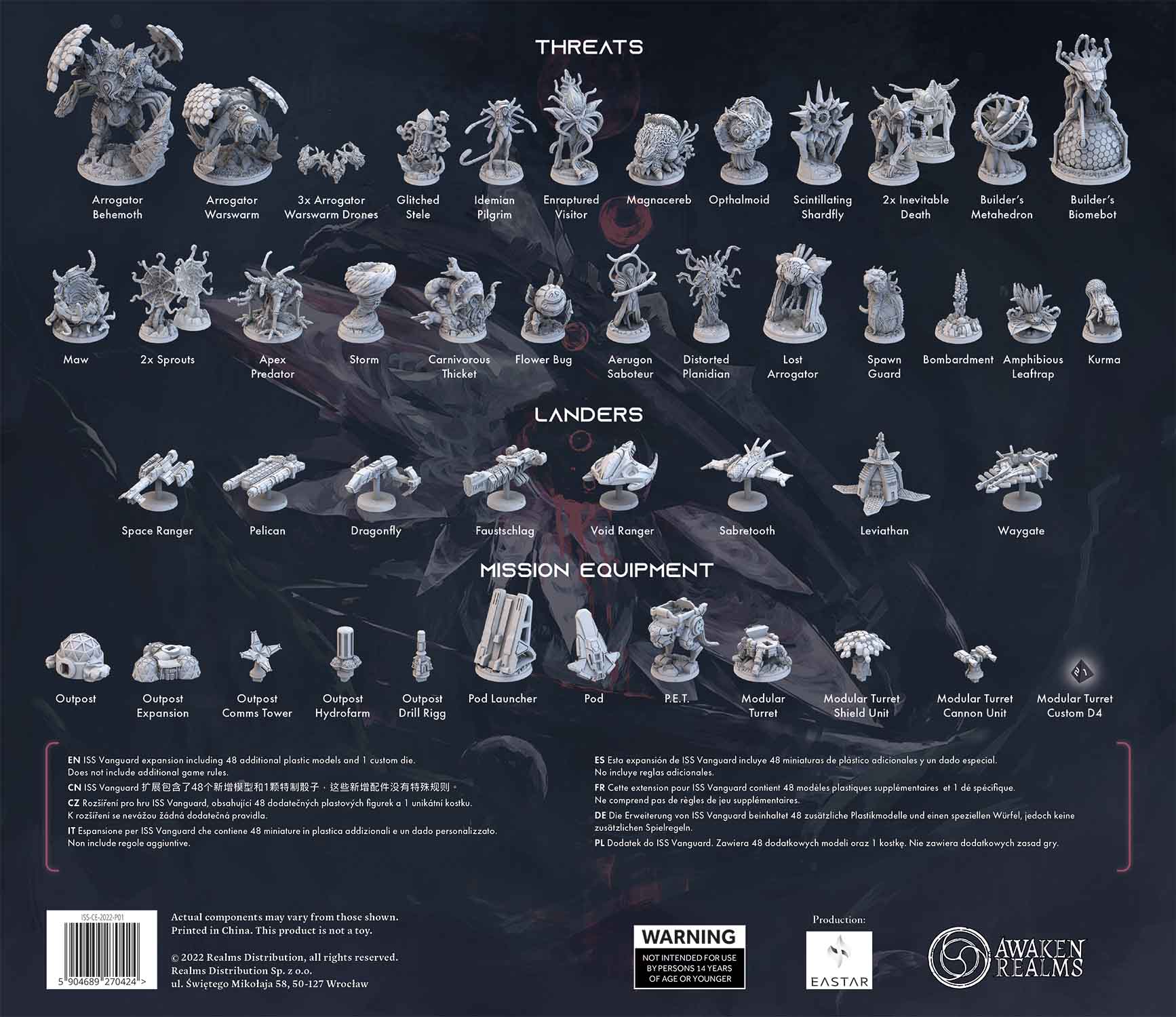 Die Erweiterung von ISS Vanguard beinhaltet 48 zusätzliche Plastikmodelle und einen speziellen Würfel, jedoch keine zusätzlichen Spielregeln.