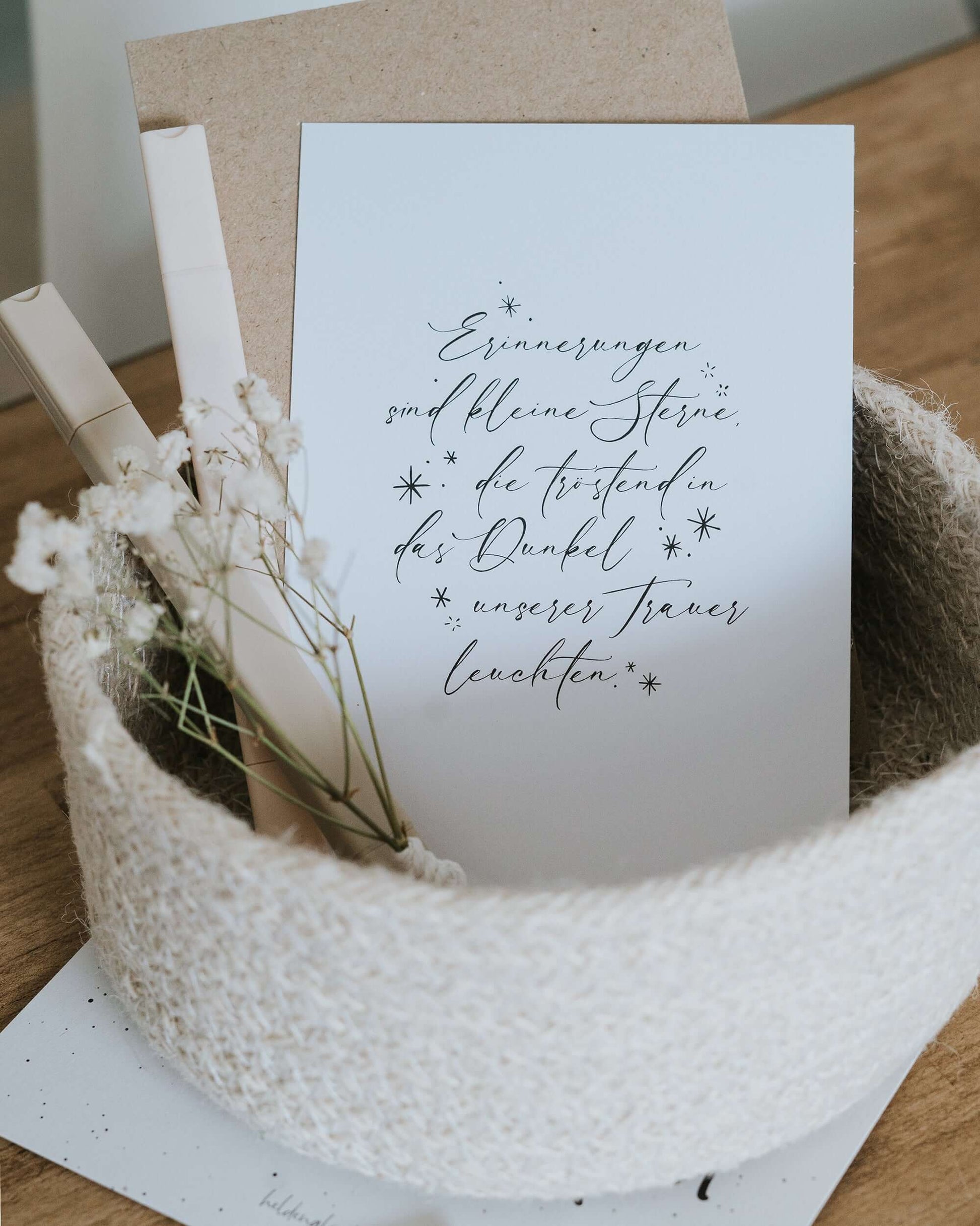 Stell dir vor, du schickst einem trauernden Menschen diese Botschaft: „Erinnerungen sind kleine Sterne, die tröstend in das Dunkel unserer Trauer leuchten.“ Ein Satz voller Wärme, Hoffnung und Anteilnahme. Diese Postkarte ist eine liebevolle Möglichkeit, Mitgefühl zu zeigen – leise, ehrlich und würdevoll. Ob zum Abschied, als Trauergruß oder als feine Geste in schweren Momenten: Sie berührt ohne viele Worte. Gedruckt auf 400 g FSC-zertifiziertem Naturpapier, fair und klimafreundlich in Deutschland hergestellt – für Trauerpost, die Haltung zeigt und Herzen erreicht.