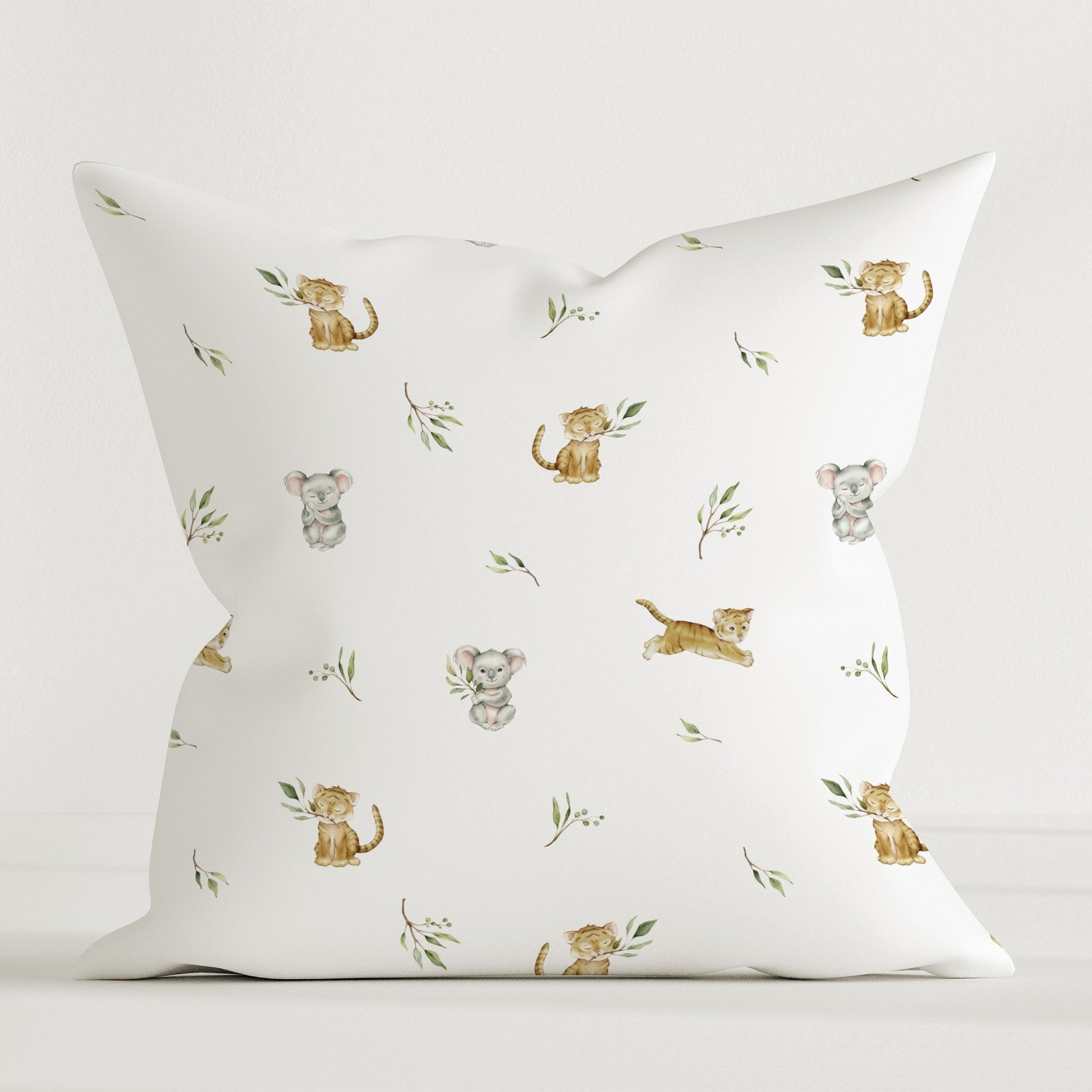 Wildes Abenteuer: Willkommen in einer zauberhaften Welt, wo freundliche Tiger und Koalas zwischen zarten Eukalyptusblättern spielen. Dieses niedliche Dekokissen aus reiner Baumwolle bietet deinem Kind eine gemütliche und sichere Kuscheloase. Das detailreiche Design mit den spielenden Tieren lädt zu entspannten Momenten ein und regt die Fantasie zu neuen Abenteuern an. Perfekt für kleine Tierfreunde und neugierige Entdecker!