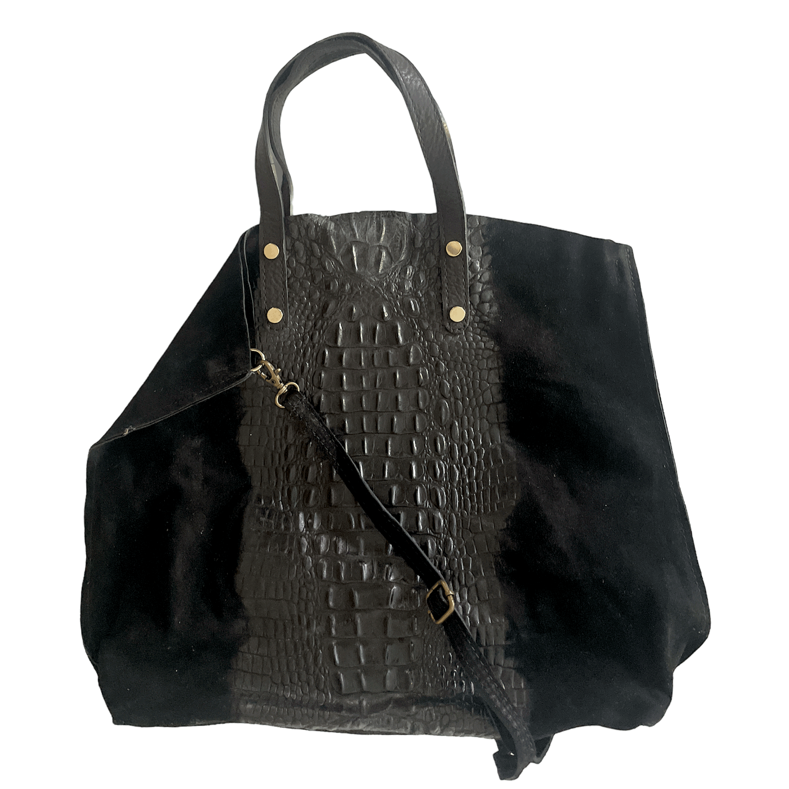 Unser Leder Beutel Tasche Krokooptik ist aus hochwertigem Veloursleder hergestellt und hat eine Breite von 37 cm und Höhe von 40 cm. Es schützt Ihre Gegenstände sicher mit seinem Futterlos made in Italy und seiner Extra-Innentasche. Mit seiner schönen Krokooptik (Prägung) in Schwarz ist es ein trendiges und zugleich zuverlässiges Accessoire.