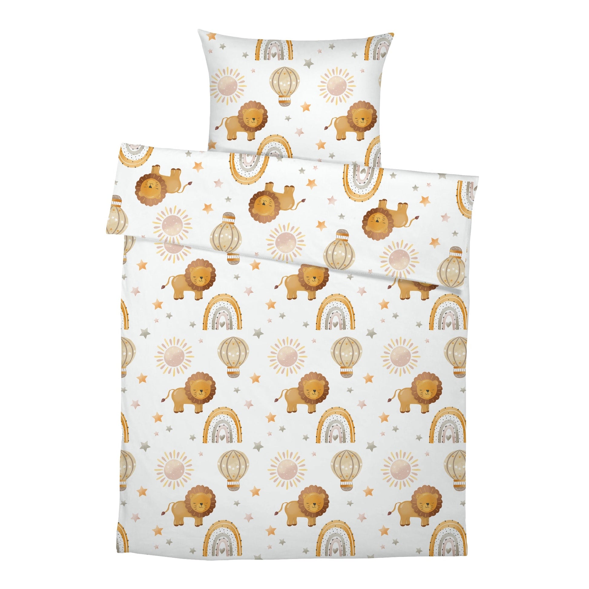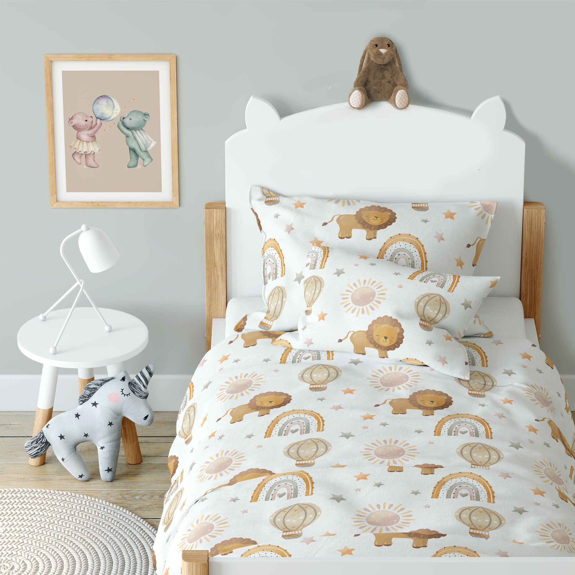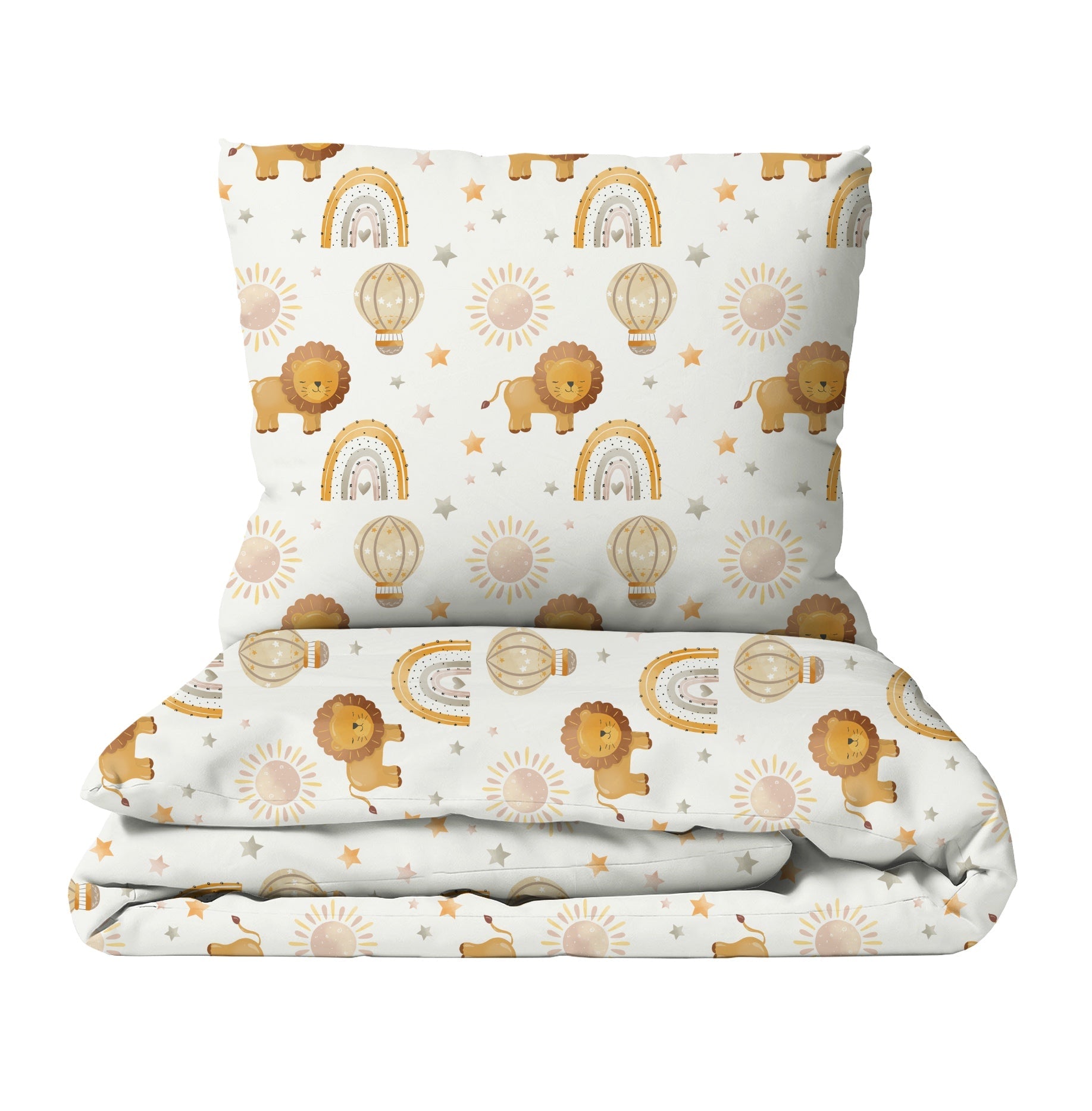 Löwen und Regenbögen Zauber: Wenn du auf der Suche nach der perfekten Bettwäsche für dein Kind bist, warum nicht ein Design mit dem Lieblingstier wählen? Unsere Löwen-Bettwäsche ist der ultimative Blickfang für jedes Kinderzimmer. Die Kinderbettwäsche mit dem liebevoll handgemalten Löwenmotiv ist deshalb besonders beliebt bei kleinen Abenteuerfans, um im Traumland viele spannende Dinge zu erleben. Mit unserer hochwertigen Baumwollbettwäsche kann man nun ganz einfach den Schlafplatz in einen magischen Ort verwandeln, in dem dein Kind sich wohlfühlen wird und entspannen kann.