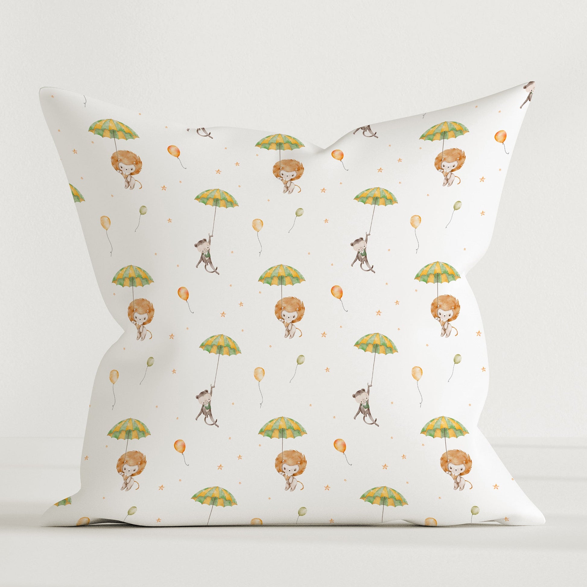 Zirkuszauber fürs Sofa: Das Dekokissen mit dem "Löwe und Affe" Design verleiht jedem Raum einen Hauch von Savannenmagie und Zirkusspaß. Ein majestätischer Löwe und ein verspielter Affe – beide im Zirkusstil – werden schnell zum Hingucker und Lieblingskuschelplatz deines Kindes.