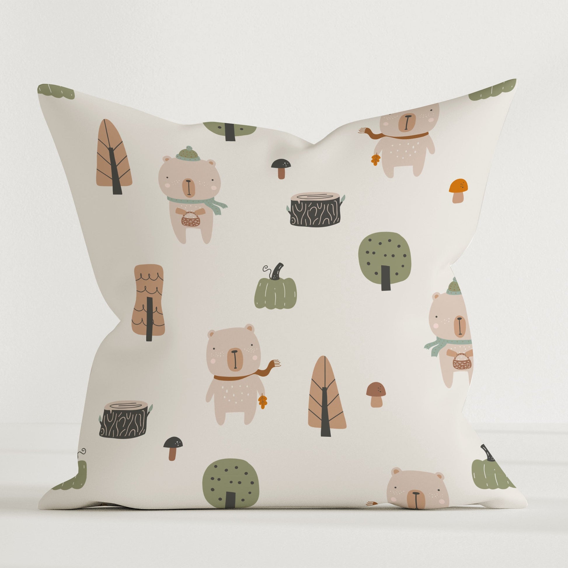 Herbstliche Gemütlichkeit: Das "Nordic Bär" Design auf diesem Dekokissen entführt dein Kind in eine herbstliche Waldlandschaft, in der ein kleiner Bär unter bunten Bäumen spielt. Die warmen Farbtöne und der freundliche Bär schaffen eine behagliche und beruhigende Atmosphäre, die zum Kuscheln und Träumen einlädt.