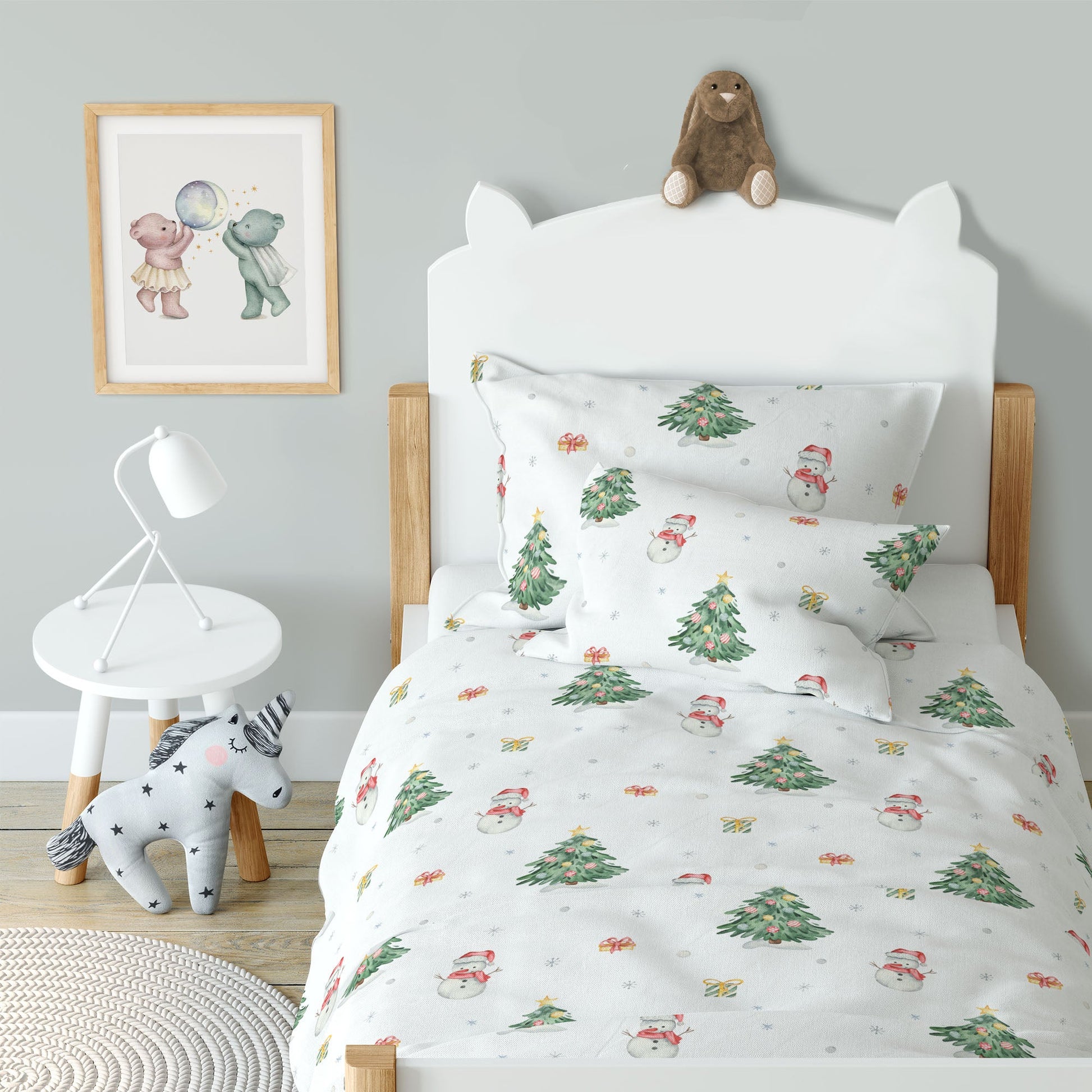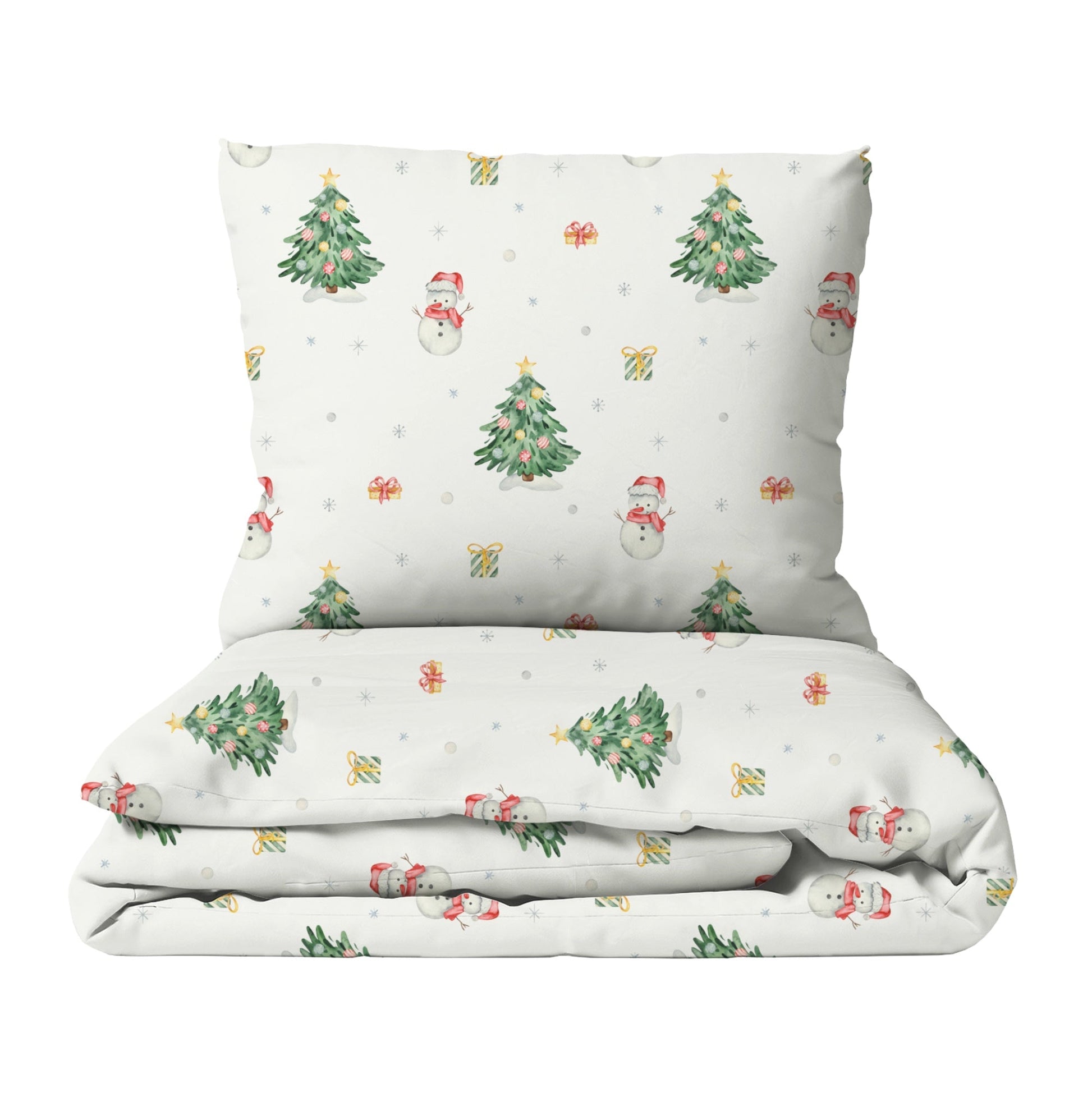 Erlebe festliche Nächte mit dieser bezaubernden Bettwäsche, die einen fröhlichen Schneemann in seiner vollen Winterpracht zeigt. Der Schneemann, geschmückt mit einem roten Schal und einer lustigen Mütze, steht mitten im Schnee und verbreitet eine fröhliche Weihnachtsstimmung. Um ihn herum funkeln die Schneeflocken und verleihen dem Design einen magischen Glanz. Jedes Detail ist in sanften Aquarelltönen gehalten, die der Bettwäsche eine warme, einladende Ausstrahlung verleihen. Diese zauberhafte Bettwäsche bringt den Zauber des Winters direkt in dein Kinderzimmer und lädt dazu ein, von festlichen Abenteuern und winterlichen Träumen zu träumen.