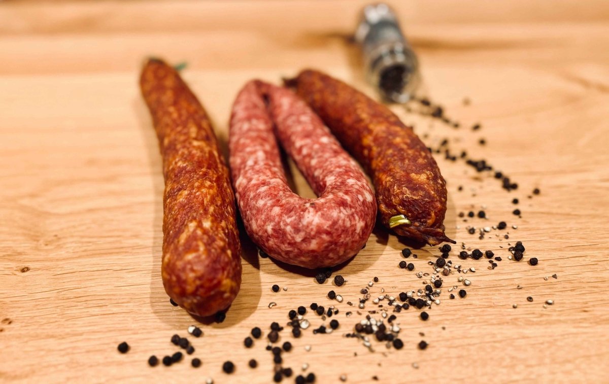 - Traditionelle Herstellung: Alle drei Wurstsorten werden aus hochwertigem Schweinefleisch gefertigt, fein gewürzt und nach überlieferten Methoden luftgetrocknet.